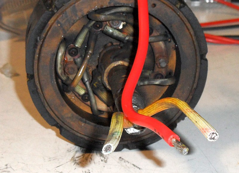 Das Schadensbild auf der Bürstenseite finde ich rätselhaft. Vier gegenüberliegende Bürsten sind noch in Ordnung und etwa zu 50 % abgenutzt. Die restlichen dazwischen - abgeschmolzen. Auffällig ist eine Stelle in der Wicklung, die durch eine Öffnung im Nabendeckel erreichbar ist. Es sieht so aus, als ob mit einem Splintentreiber und Hammerschlag von aussen durch die 4 mm Öffnung die Wicklung durchtrennt worden ist. :o