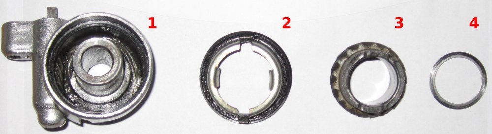 Zur besseren Orientierung habe ich die Tachoschnecke zerlegt abgelichtet und nummeriert. Das mit "3" markierte Bild ist der Innenläufer? Ein paar Zähne (17 in Summe) sind an den Kanten ausgerissen. Ich würde das Teil als defekt deklarieren. Das Gegenstück im Gehäuse "1" ist vermutlich dadurch auch beschädigt. Daher würde ich gerne alles inkl. Tachowelle auswechseln.