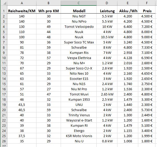 Tatsächlich gibt es ca. Werte von 30 - 60 Wh Verbräuche auf den Kilometer. Bei Niu gibt Niu selbst diese Werte an. Schwalbe, Vespa & Velocipedo kommen real auch tatsächlich auf die schlechten 60 Wh (die sind aber min. 30 kg schwerer als viele der anderen Modelle).