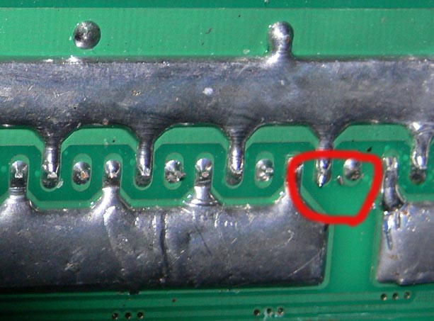 Nach meinem Begutachten des Schadens ist folgendes passiert: Ein übernächtigter Chinese hat bei Überstundenarbeit die Lötspratzer nicht richtig entfernt. Der Controller war zum Scheitern verurteilt. Wenn Ihr Euch mal die voherigen Bilder von mir richtig anschaut so seht Ihr die Transistorschraube die ich rot markiert habe "voller Lötzinn". Davon habe ich einiges in direkter Nähe der jetzt eliminierten Transistoren von der Platine entfernt. Man sieht das nur richtig mit einer guten Lupe. Wie im unteren Bild markiert können solche nicht entfernten Lötspratzer verheerende Folgen haben (obwohl das dort noch zu vernachlässigen ist). Habe oben richtig fette Kleckser entfernt, so dass ich dort von einem Kurzschluss ausgehe. Muss das Gewissen meines Freundes, dem das ja (dann doch zufällig) passiert ist damit mal entlasten. Das hätte mir sonst mit Sicherheit auch geblüht. Die Elkos sehen alle prima aus. Die restlichen IRFB 4310 im noch eingelöteten Zustand auf Funktion zu messen macht wohl wenig Sinn?