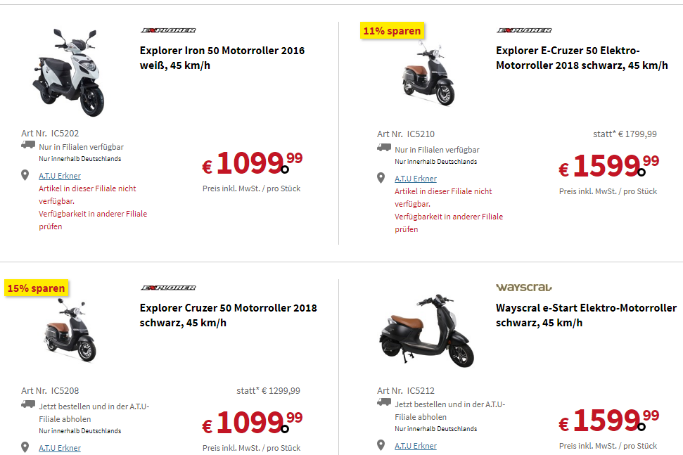Aha, und ich war genau zur gleichen Zeit, also vorgestern beim ATU, die den kleinen E-Roller mit dem merkwürdigen Namen im Laden stehen hatten, und hatte trotz des am Roller hängenden alten Preises von 1299 Euronen keinen Erfolg mit der Preisverhandlung. Obwohl, wie erwähnt dick und groß der reduzierte Preis am Schild stand, konnte man den Roller auf keinen Fall zu dem Preis herausgeben, da im Internet der neue Preis hinterlegt war. Maximal 100 Euro darf die Filiale in bestimmten Fällen unter dem Online-Preis bleiben, wurde mir mitgeteilt...