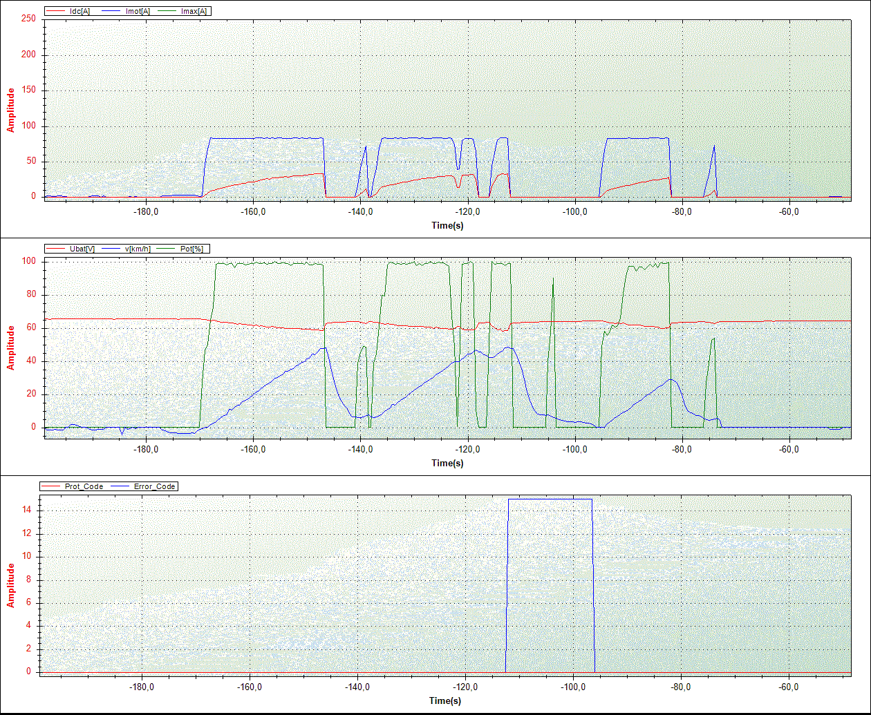 2. Den Parameter 3 - wie von Euch empfohlen - auf 2 gesetzt. Ich bin dann nur noch mal kurz die Straße hoch und runter. Der Roller kam mir noch leiser vor, kann aber auch daran liegen, daß ich keinen Helm aufhatte :o . Nicht daß der Roller jetzt etwas schneller fahren würde, oder der Controller am Ende nicht doch noch mal kurz abgeschaltet hätte, aber Ihr seid trotzdem meine Helden, denn die Imax Kurve (oberer Graph, grüne Linie) hat nun keine Einbrüche mehr und es hat keine Protection Errors (unterer Graph, rote Linie) mehr, siehe Bild: