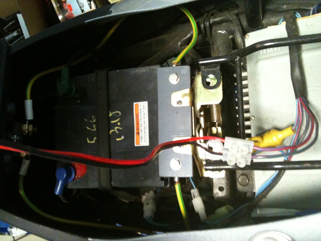 Der Rote Knochen sitzt im Helmfach und hat von unten dicke und fette Schrauben für beide Kabel zum grauen Riegel.