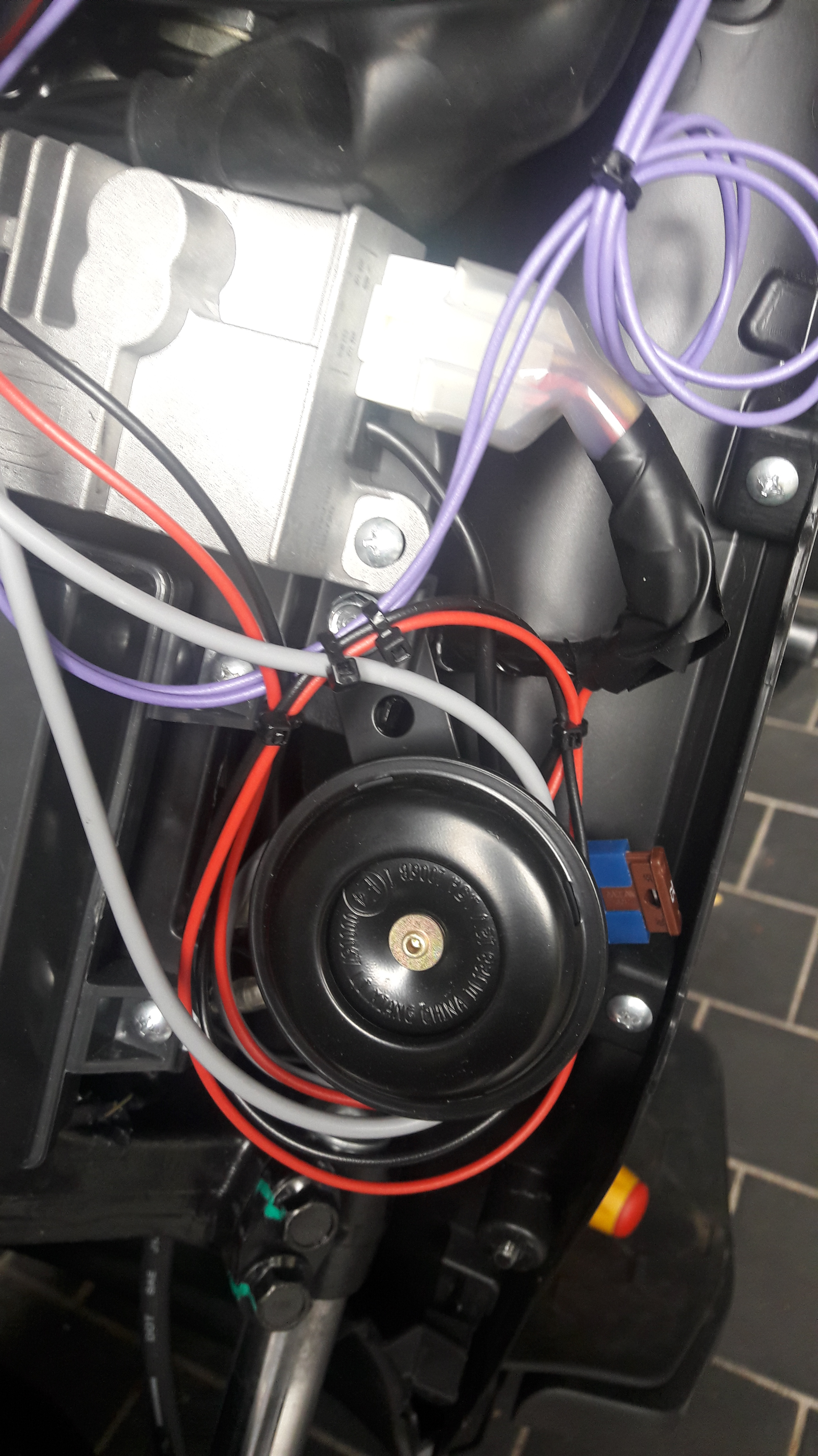 hab mir den BLE5 kurzerhand eingebaut. Habe allerdings den Einbauort vorne gewählt. War recht einfach. Frontschield an den sechs Schrauben gelöst und schon hatte ich Einblick in einen Kabelwust. Erste Schwierigkeit waren 12V zu finden, da an vielen Stellen nur um die 60V zu finden waren. Selbst am USB Modul liegen 60V an. Nach ein7ger Zeit am silbernen Modul 12V gefunden. Siehe Bilder. An den unteren beiden Pins liegen 12V an. Schwarz-Rot +12V . Da habe ich das rote Kabel vom BLE5 angeschlossen. Daneben Masse. Schwarz.
