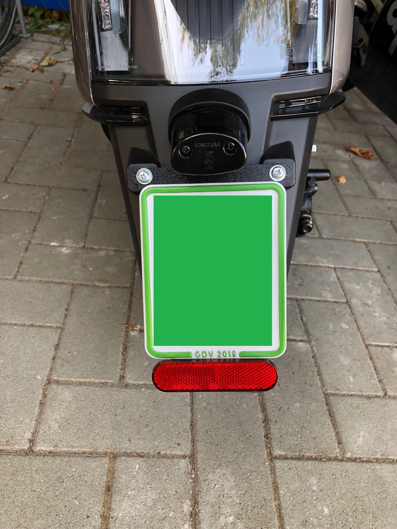Ich habe auf die Schnelle einen rahmenlosen Kennzeichenhalter mit passender Anbringung für den originalen Reflektor erstellt, kein Meisterwerk, aber funktionell und nutzbar.