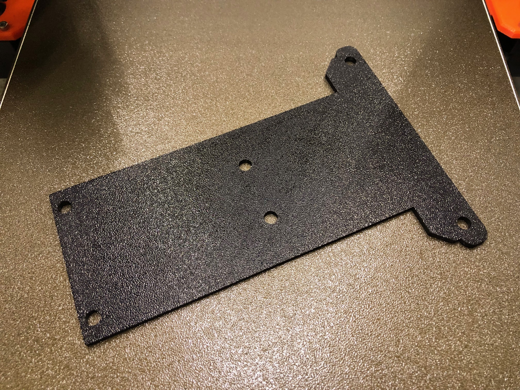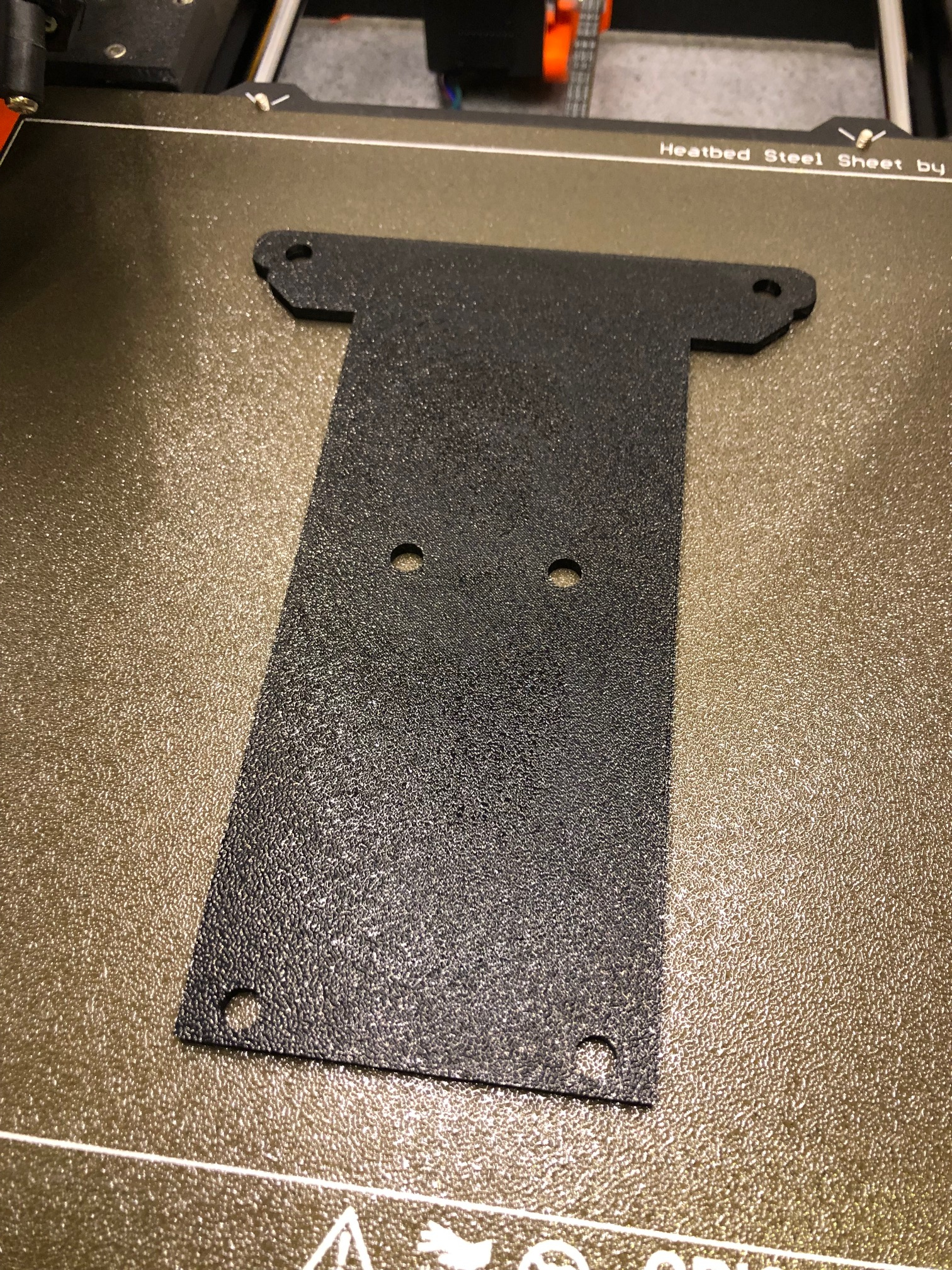Den Halter habe ich auf meinem originalen Prusa MK3 in schwarzem ABS gedruckt, in PETG wäre es auch möglich, von PLA nehmt jedoch bitte Abstand.