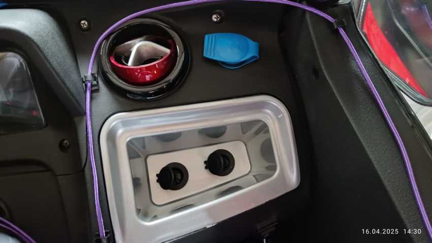 In die Schalen Löcher gebohrt, damit man bis zu 4 Zigarettenanzünder-Buchsen anbringen kann. Hier stehen nun 3 Zigaretten-Stecker hochkant drin und nehmen vorne am Armaturenbrett keinen Platz weg (Kniefreiheit).