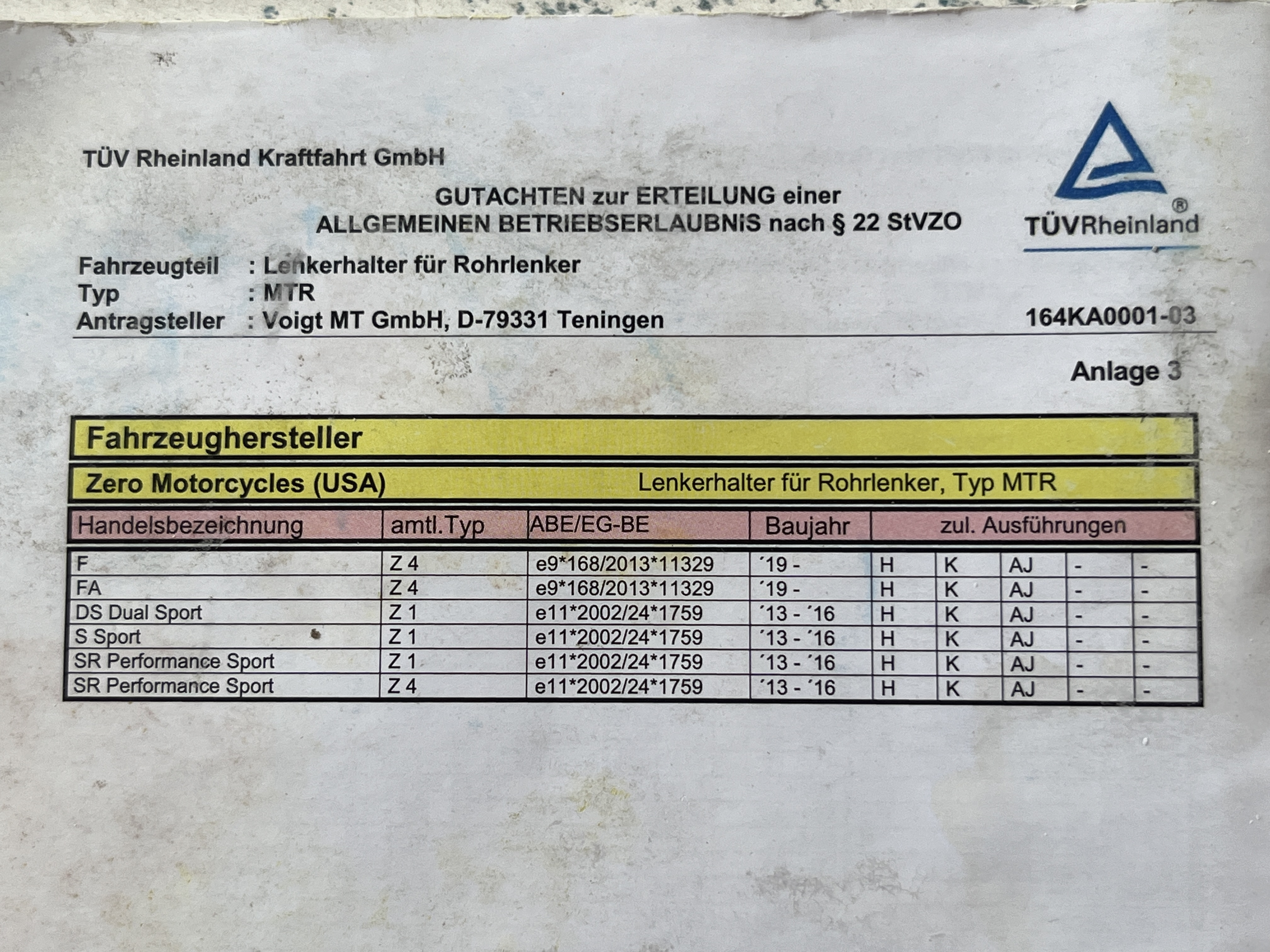 Lasse Dich da nicht täuschen! Ich habe an meiner 2017er S mit DS Lenker diese +30mm plus 21mm Versatz Lenkererhöhungen schon seit vielen Jahren und mindestens 2 HUs im Einsatz, und die ABE besagt die Gültigkeit für S und DS von BJ '13-16, wobei sie heutzutage von '13 bis '19 zulässig ist: