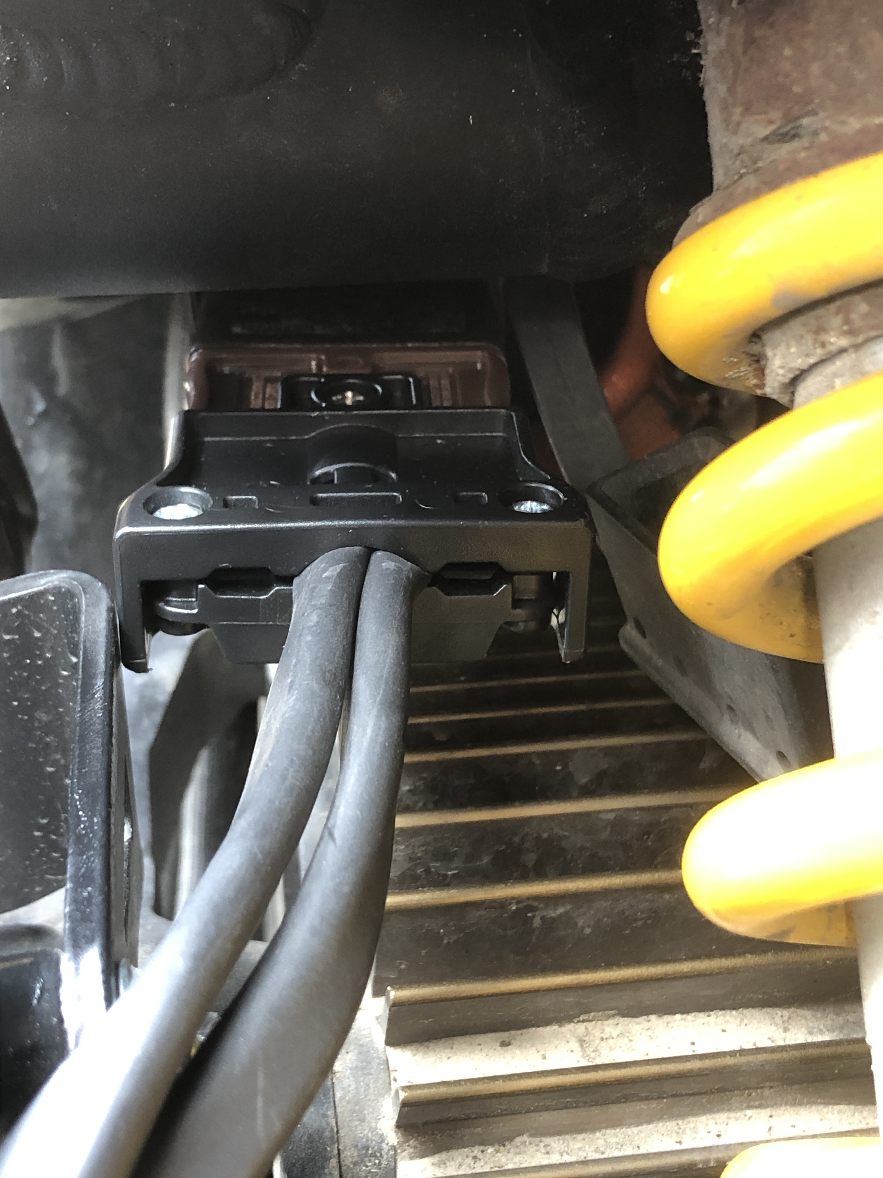 Der Ladeadapter passt jetzt gerade so am ausladenden Givi-Halteblech vorbei rein, es ist jetzt sogar einfacher, den Gegenstecker zu treffen, da der vorige wirklich höchst dubios war: