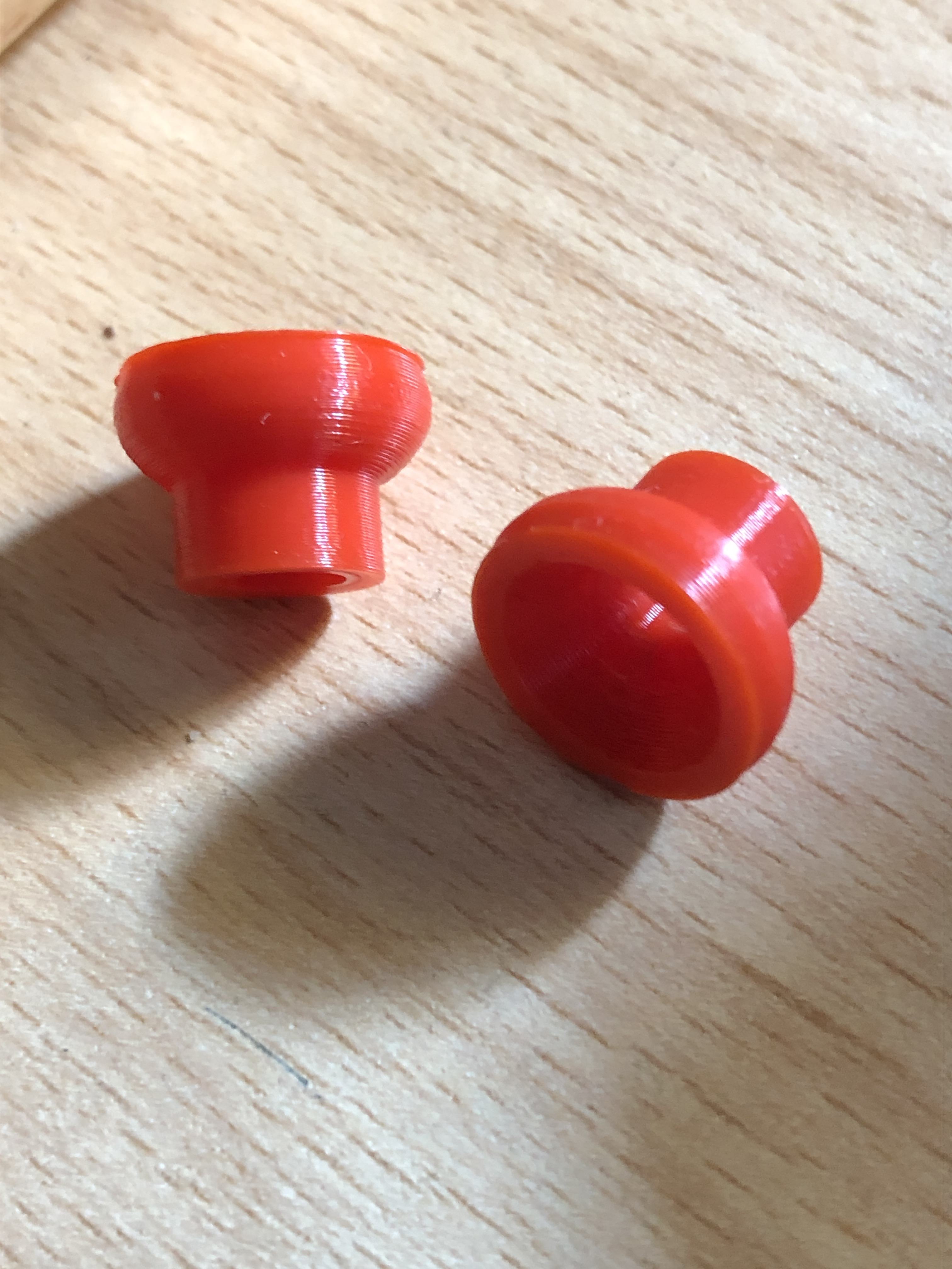Da entstand schnell die Idee, die Dinger aus besserem Alu zu drehen. Ein US Zero-Kollege, der einen Metallbearbeitungsshop betreut, hat sich dafür angeboten, wenn er die genauen Maße erhält. Die habe ich dann an meinen schon mitgenommen aussehenden "Haken" abgenommen und aufgezeichnet. Daraus hat er ein CAD Modell generiert und mir eine STL Datei davon geschickt, so dass ich bei einem Arbeitskollegen mit eigenen 3D Drucker ein paar Probe-3D-Drucke davon machen lassen konnte. Und dann gleich vor Ort auf Passgenauigkeit prüfen konnte - alles Bestens