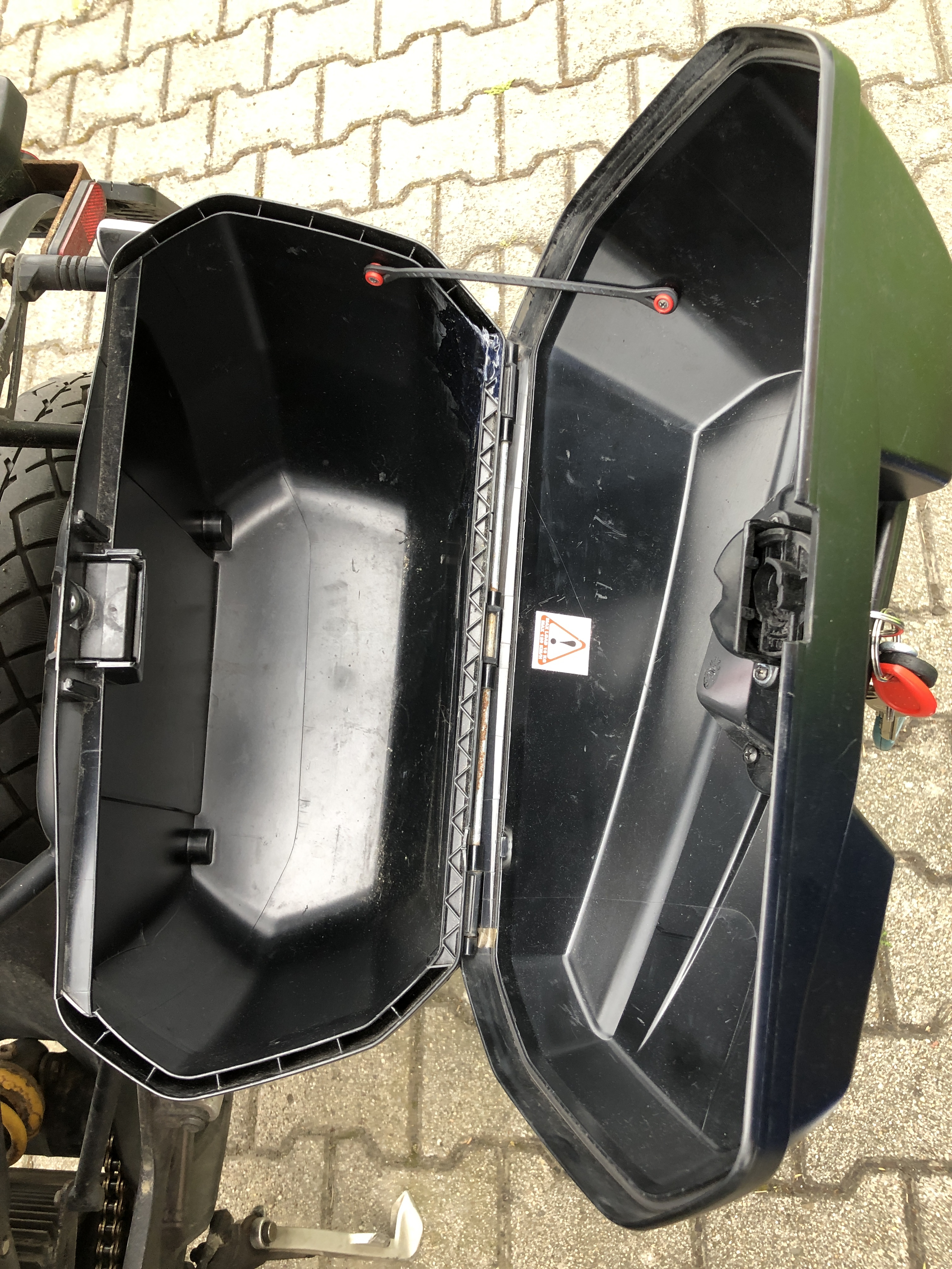Dies Woche, am Dienstag, ist ein Malheur passiert mit dem linken Seitenkoffer. Den nutzte ich bei zwei Fahrten in der Woche, um meinen Geschäftslaptop darin zu verstauen. Ich hatte den Deckel offen, und als ich die Laptoptasche mit dem Tragegurt über den Helm hob, um sie in den Steitenkoffer zu versenken, rutschte sie mir aus den Händen und fiel auf den offenen Deckel, so dass es die hintere Seitenwand oben rausgerissen hat
