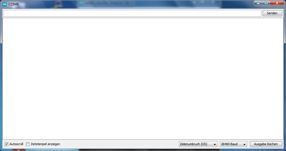 Vor dem ersten Start des Programms den USB-TTL Adapter in den Laptop stecken, so dass er erkannt wird. Dann das Arduino Programm starten, was ggf. etwas dauert. Auf "Werkzeuge" klicken und zuerst bei "Port" den vom eingesteckten USB Adapter angebotenen COM Port auswählen. Dann "Serieller Monitor" auswählen. Dies ist ein sogenanntes Terminalfenster. Das sollte dann schlussendlich so aussehen: Unten links "Autoscroll" anklicken. Unten, im dritten Fenster von rechts "Zeilenumbruch (CR)" auswählen. Rechts daneben "38400baud" auswählen.