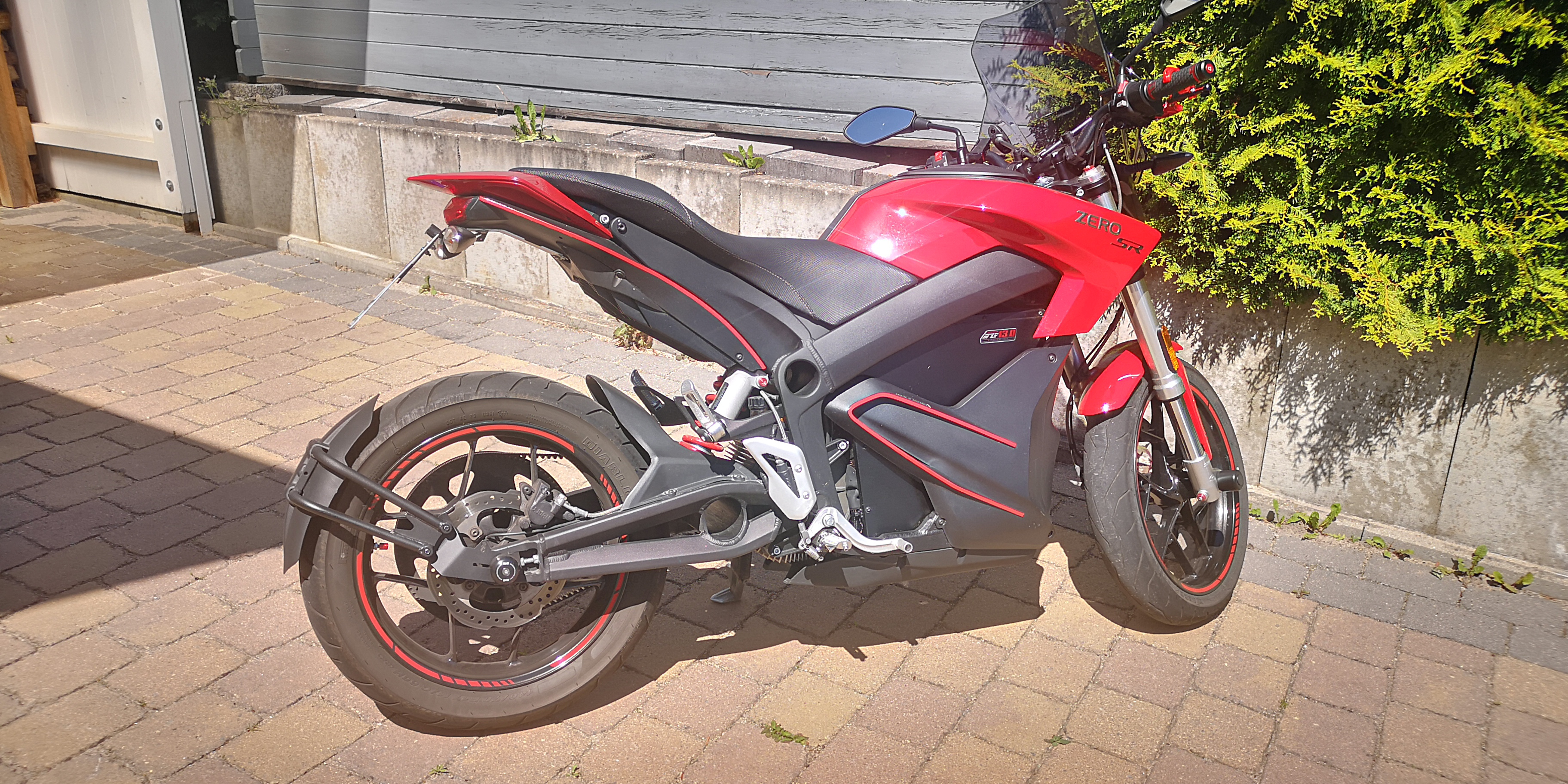 Seit Ende Februar bin ich im Besitz einer gebrauchten Zero SR ZF13.0 - und habe jetzt auch ein paar Modifiktaionen vorgenommen. Optisch weniger schön, aber zum Schutz vor Wind und Regen das Schild von Puig. Dann etwas dickere und gröbere Griffe, die passenden Lenkerenden und ein neuer Bremshebel von ProBrake. Der Orginal Bremshebel liegt mir gar nicht gut in der Hand und ist mir auch zu lang, ich greife den Hebel gern kurz vor dem Ende und nur mit 2 Fingern. Hebel weiter nach innen auf dem Lenker schieben ging nicht - denn dann war im Spiegel gar nichts mehr zu sehen (ist eh schon recht wenig) - den der Spiegel ist ja auf der Bremsschelle montiert. Außerdem gefällt mir der neue Hebel optisch besser ist in der Hebelweite sehr einfach und auch während der Fahrt einzustellen und im Falle eines Falles klappt er weg. Optisch gab es ein paar rote Streifen auf der Akkuabdeckung und unter dem Sitz und Aufkleber auf den Felgen.