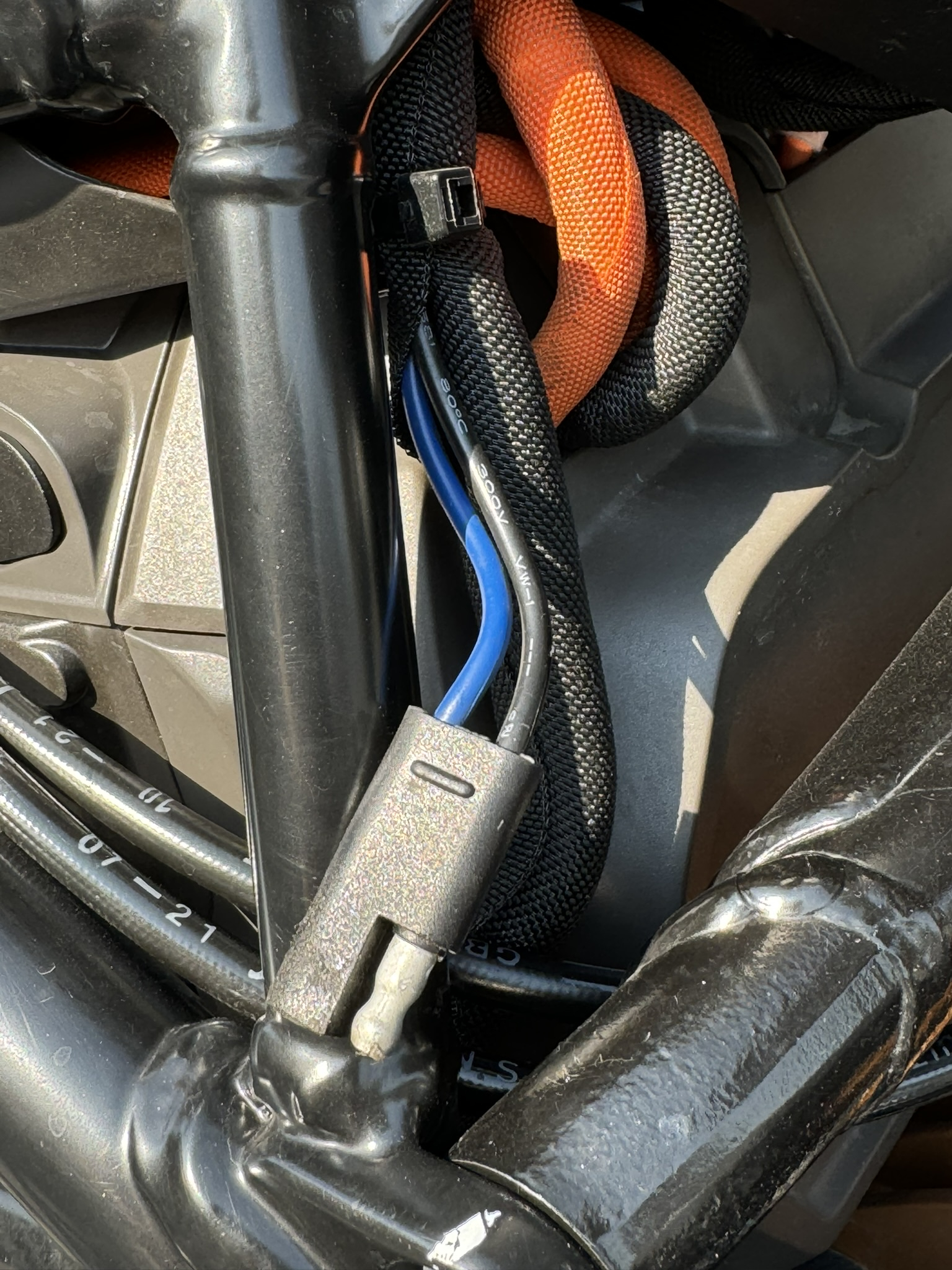 Das ist ein SAE-Stecker mit 12V für Accessoires, der Strom führt, wenn das Moped eingeschaltet ist. Erwähnt wird er auf Seite 6.36 Deiner Bedienungsanleitung. Frag doch mal den Händler, ob da eine Schutzkappe drauf gehört.