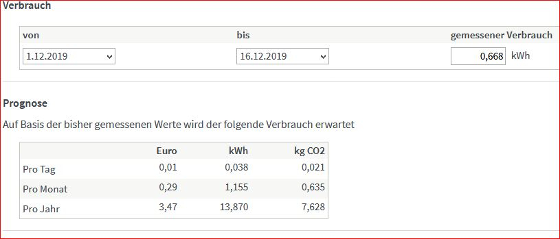 Relevant ist der gemessene Verbrauch in dem genannten Zeitraum von 0,67kWh seit Anfang Dezember. Das wären dann rund 1,5kWh im Monat, oder 18kWh im Jahr was bei 0,25€ pro kWh etwa den genannten Betrag ausmacht.