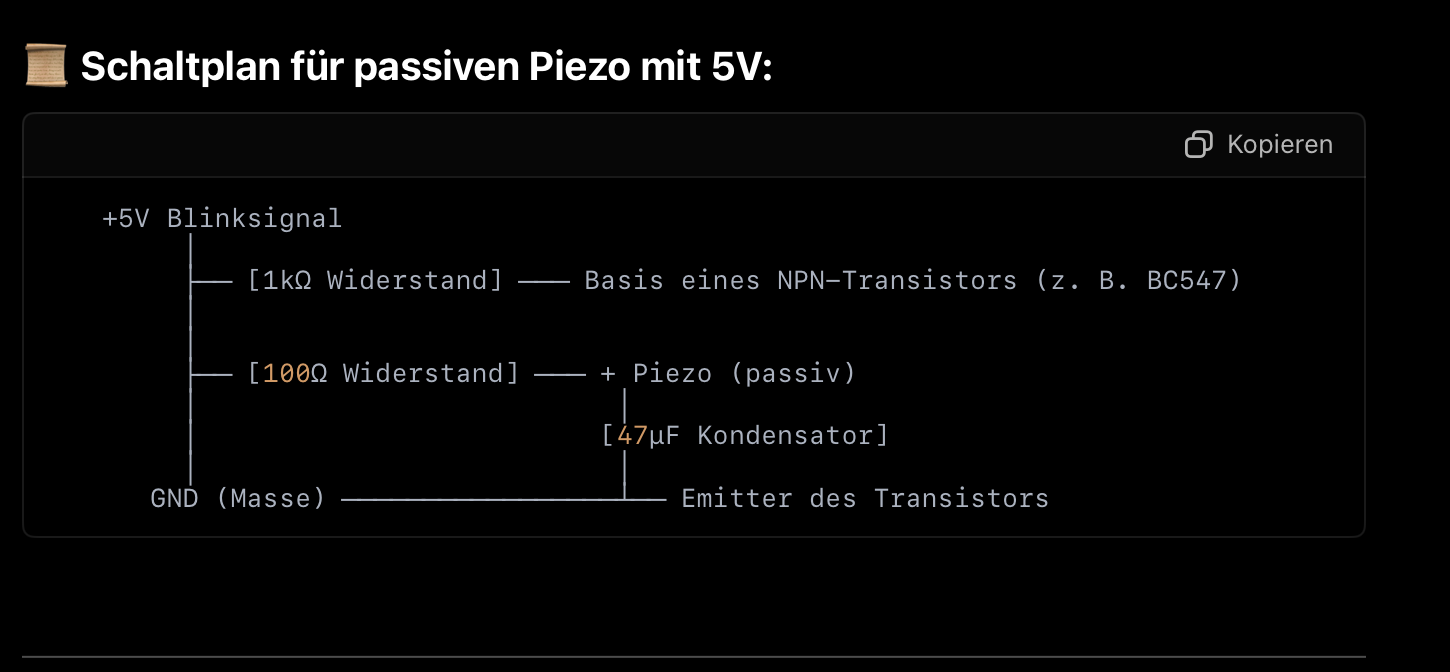 Im letzten Schaltplan haben Kollektor des T und - des Piezos keinen Kontakt. Also nein: Die Schaltung würde nicht funktionieren. Du kannst mir jetzt auch noch 10 weitere Schaltungen vorlegen in ähnlicher Art, mit mglw. ähnlichem Ergebnis. Am Ende helfen ein paar Ideen (hatte ich weiter oben schon) und dann bin ich ein praktischer Mensch: Ich stöpsele sowas gern auf dem Steckbrett zusammen und probiere mit einem Taster (hier besser Umschalter) am Labornetzteil, ob das funktioniert. Wenn ich da eine einfache nonplusultra-Lösung im Kopf hätte, wäre das längst passiert.