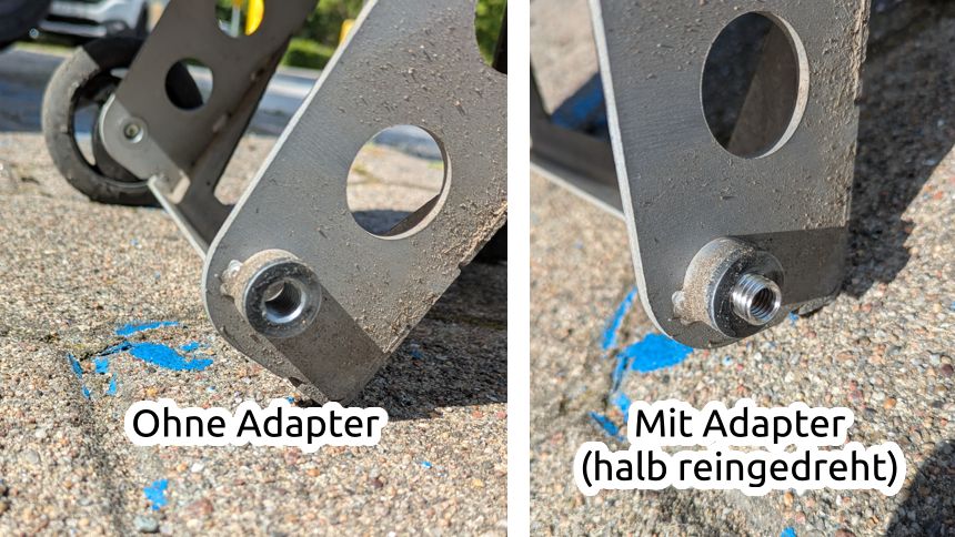 Das funktioniert soweit auch sehr gut. Ich konnte die Adapter ohne Probleme in die Windung der Arme reinschrauben und konnte danach die M8 Schrauben verwenden, die die Kickroller-Räder als Achse benötigen.