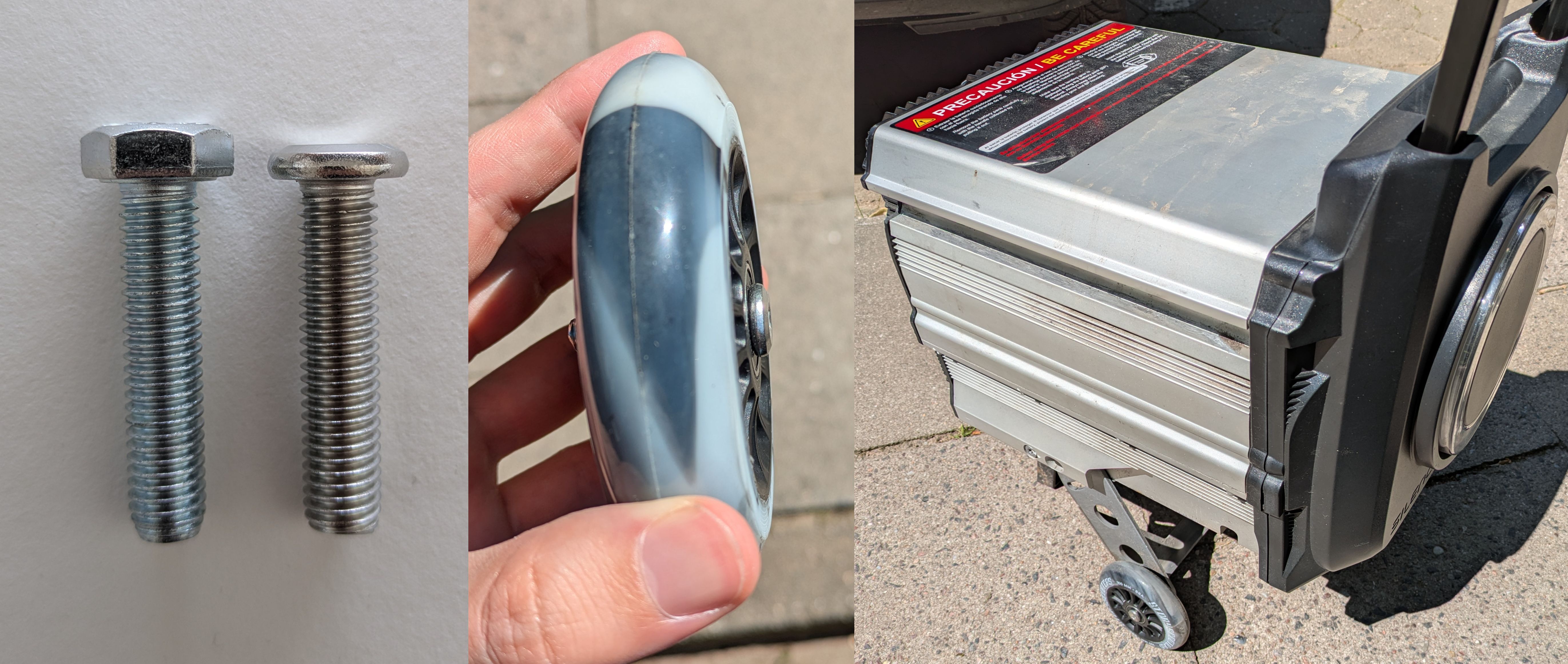 Ich hatte zunächst Sechskantschrauben mit etwas dickerem Kopf benutzt, um die Räder anzubauen. Ich musste aber feststellen, dass man den Akku dann zwar mit etwas Schwung ins Akkufach reinbekommt, er aber auf halbem Weg stecken bleibt.