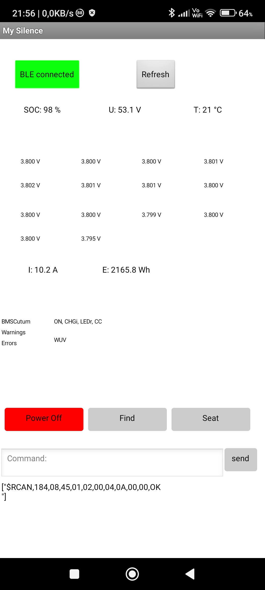 Diese App wertet, anders als die Erste weiter oben, die Daten aus, die das BMS über den CAN-Bus sendet. Deshalb das BMS eingeschaltet sein, damit überhaupt Daten angezeigt werden. Dafür muss man den Roller einschalten, den "Find" ausführen oder den Akku im Roller laden. Beim Laden wird der CAN-Bus nach Drücken der Refresh Taste abgefragt. ansonsten direkt beim Einschalten oder Ausführen des "Find".