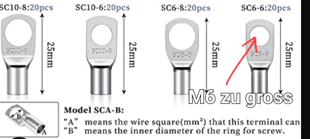 Nein, der " Ärmel" ist nicht das Problem, ich finde online keine Kabelschuhe mit 3 oder 4mm Loch ausser bei Bestellung von 100Stück aus Taiwan mit LT Ende Feb 23. Bei Amaz kriegt man als kleinste Grösse für 6mm2 Kabel nur SC6-6 mit 6mm Loch. Ein 4mm2 Kabel wollte ich eigentlich nicht verwenden.