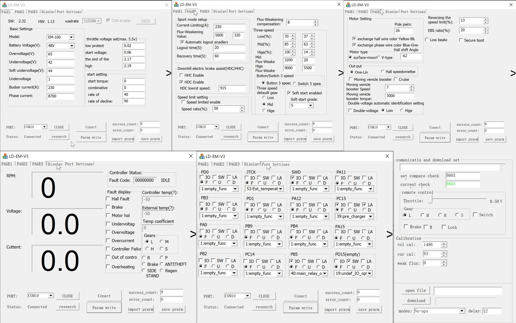 Ich vermute, dass nach einem Klick auf "Conect" die Parameter vom Controller gelesen werden, jedoch nicht ständig und dauerhaft, "success count" steigt nur nach dem Knopfdruck. Aber auch so bekomme ich keine Anzeigen von Speed, Drehzahl und Throttle aktualisiert, genau wie bei Rudi.