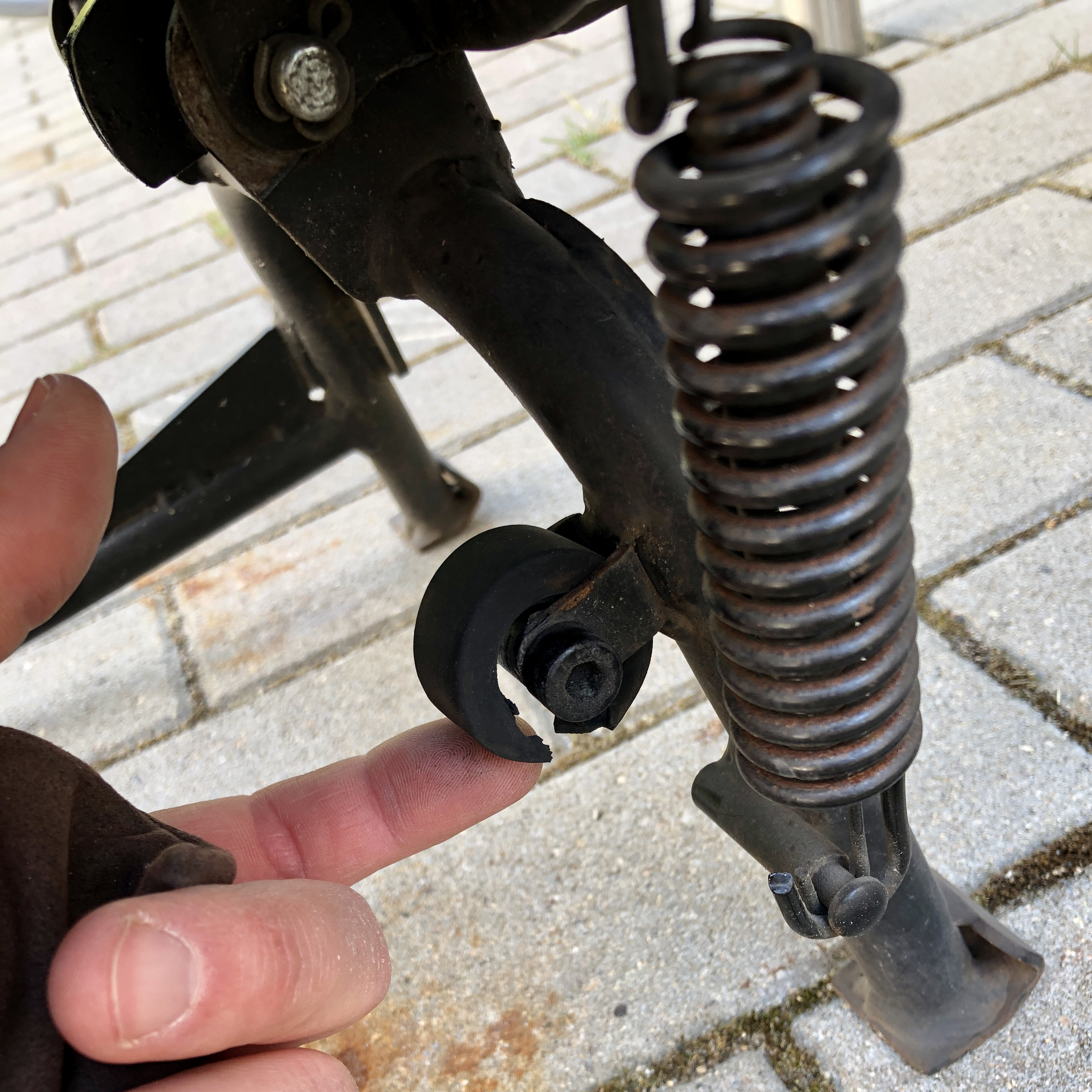 Sowas passiert auch bei anderen Herstellern. Das liegt daran, dass das Gummi ständig auf das Gewinde der Schraube schlägt. Irgendwann ist der Gummi dann durchgeschnitten durch das Gewinde. Wer seinen Roller etwas pflegt, bremst den Hauptständer mit dem Fuß ab oder nutzt den Seitenständer. Oder man investiert halt den Zehner…