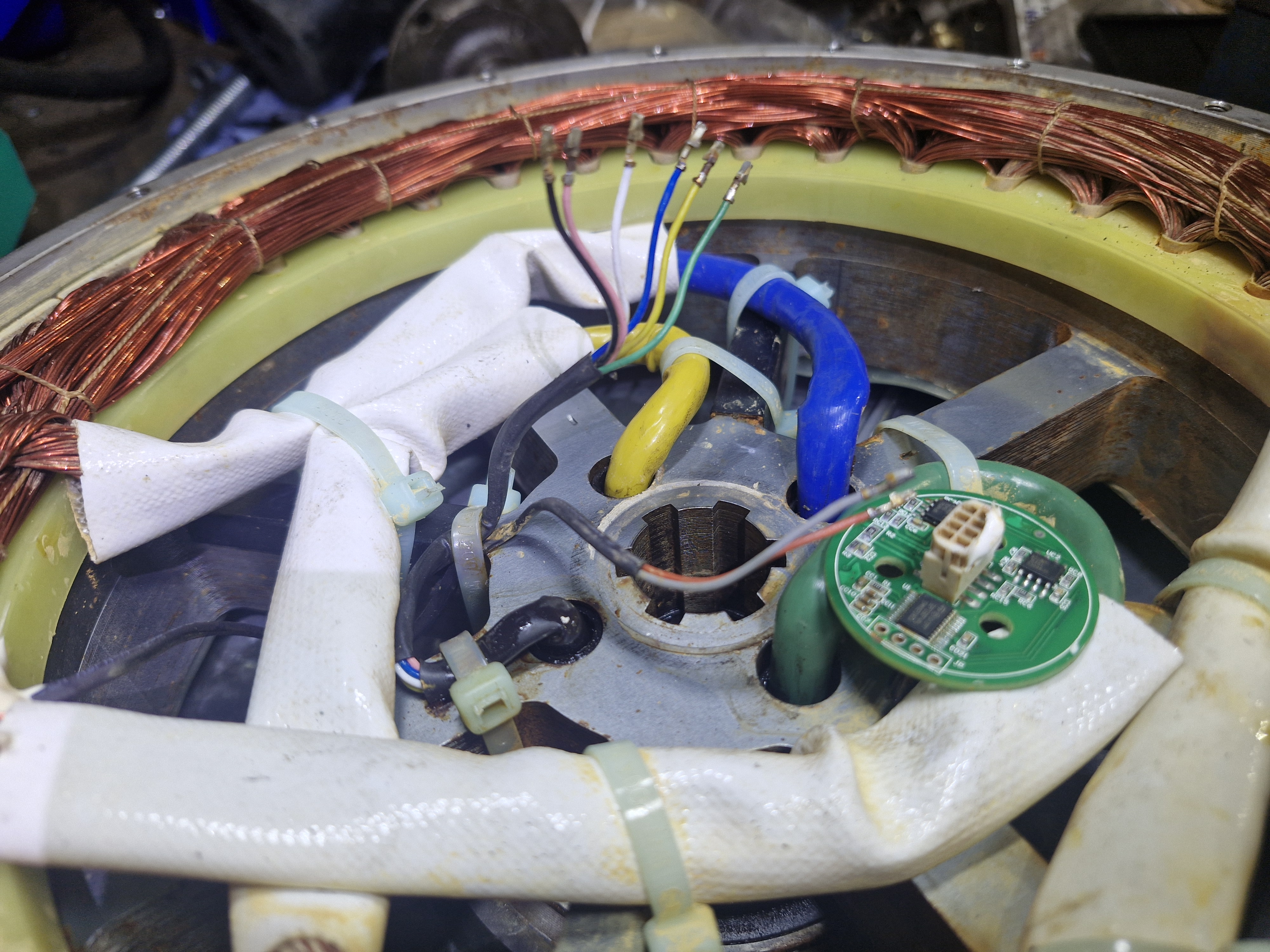 The round circuit board is obviously the sin/cos encoder, which is also installed in some S01s with Votol. I had already removed it in my S01 with Sevcon, but it is wired differently there, only 4 wires, directly soldered, according to my memory. Hopefully you can find someone with Votol who can have a look at it or has a picture.