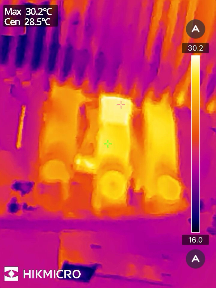 Habe auch etwas Bike-Porn für Euch: Der Motor, aufgenommen nach etwa 6km Fahrt. Der Controller. Die 75,2° finden sich ganz am Rand, beim Anschluss DC-DC. Hier ist der Steckeranschluss des DC-DC Wandlers schön zu sehen. Finde ich sehr verwunderlich, dass am Kabel direkt am Stecker dann doch 73° anliegen (Bild zuvor sogar 75). Hier scheint die Leitung unterdimensioniert. Ist aber alles Serie, werde ich einfach mal bei längerer Fahr beobachten. Das sind die Phasensnschlüsse zwischen Motor und Sevcon Motor linksseitig. Temperatur unbedenklich. 53° liegen am Motorlüfter an. Der lief ja durchaus länger…
