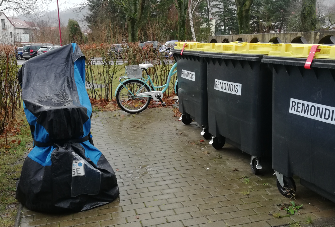 Gestern Abend war starker Wind und als ich vom Balkon aus zum Parkplatz sah standen die Container auf dem Parkplatz verteilt. Sie wurden durch den starken Wind bewegt. Dabei hatte ein Container den Roller vom Hauptständer gestoßen und umgeworfen. Durch die Abdeckplane und dadurch das er in die Hecke fiel war nichts weiter passiert.