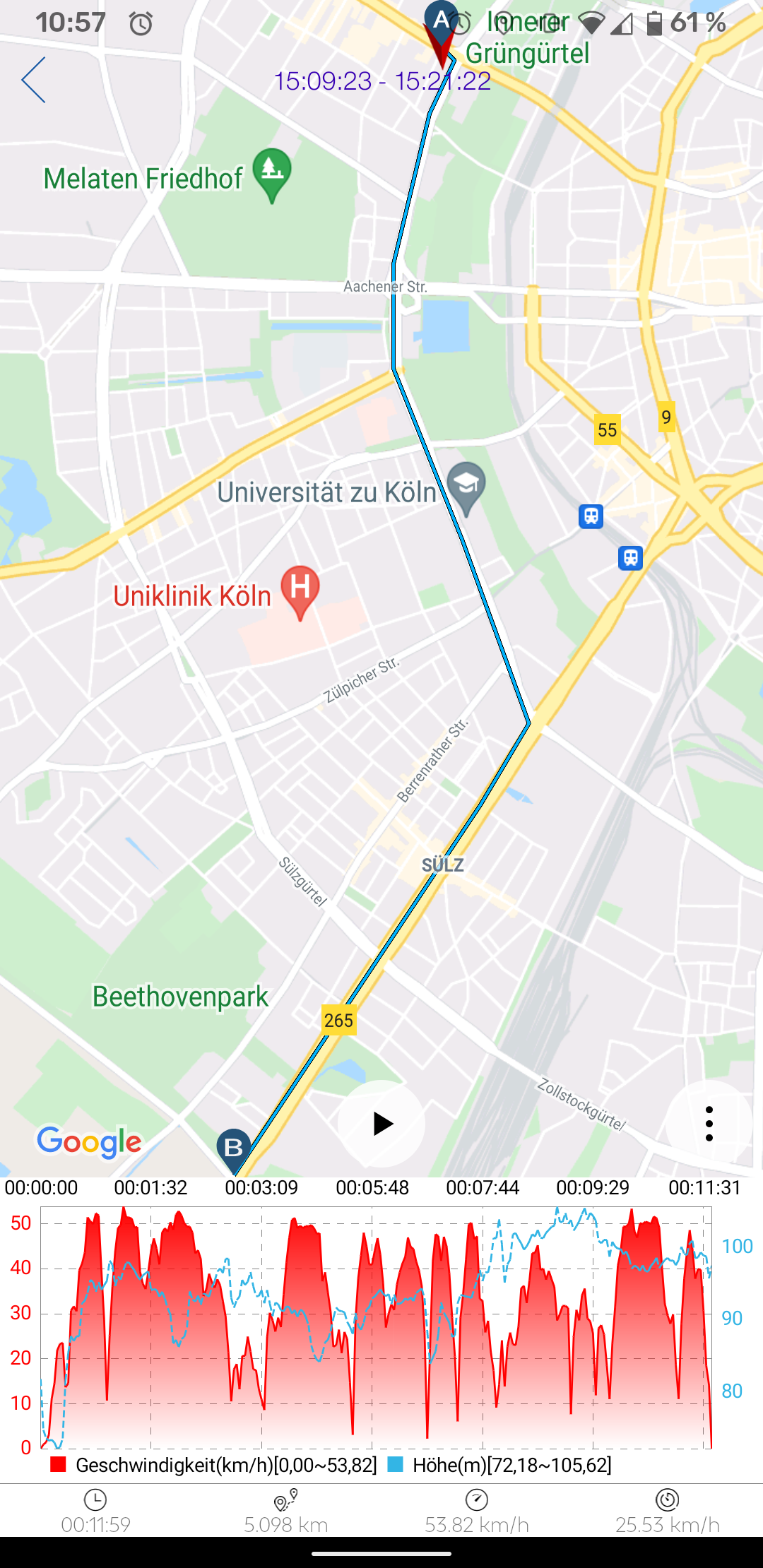GPS Messung war bei Akkustand von ca. 50%/60%, ich sag es deshalb weil bei 100% Ladestand noch etwas mehr Beschleunigung/Geschwindigkeit drin ist. Hier bei der Aufzeichnung ist Die Höchstgeschwindigkeit 50,23kmh, aber wie gesagt bei Akkustand 50/60%...