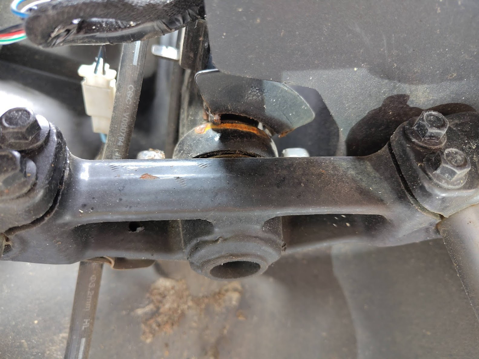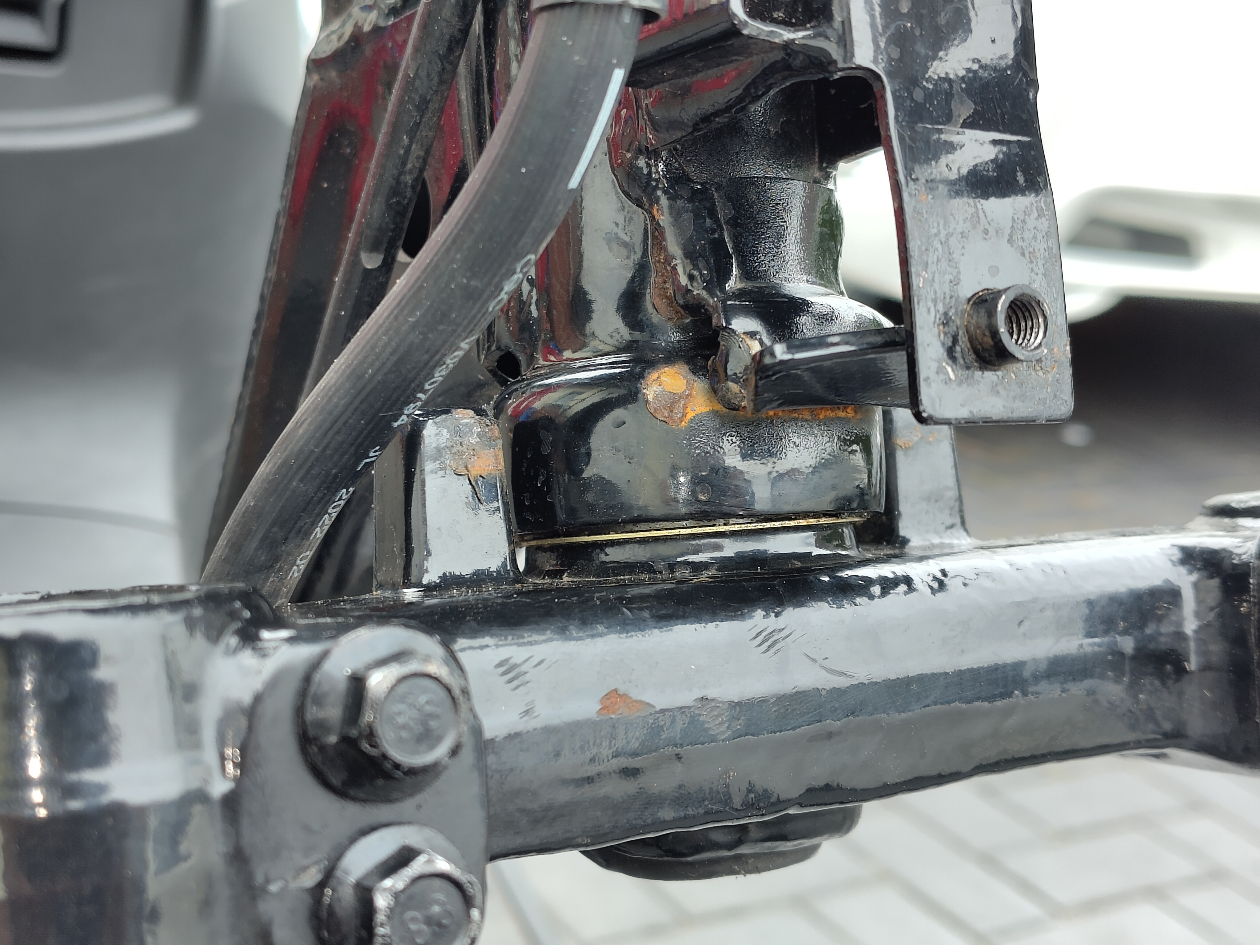 Hab nun alles freigemacht, im Rahmen sind keine Risse oder so, der Reifen mitsamt Stoßdämpfern steht ganz minimal schief, ich denke, das wird das untere Lenkkopflager sein. Anschlagpunkt anschweißen auf jeden Fall, das ist aber nur n Metallteil, das mit 2 Punkten am Rahmen angeschweisst ist. Das ist kein sicherheitsrelevantes Problem, wenns stabil behoben wird.