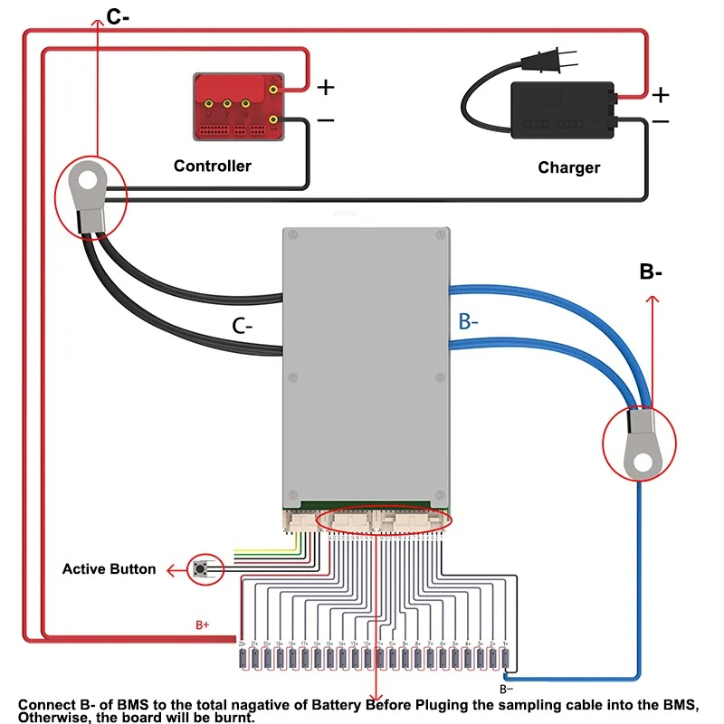 3. Verbinden Sie B- des BMS mit dem Gesamtnegativ der Batterie, bevor Sie die dünnen AWG22 Probenahme Messkabel 14pol 12pol in das BMS einstecken. Andernfalls wird die Platine verbrannt!