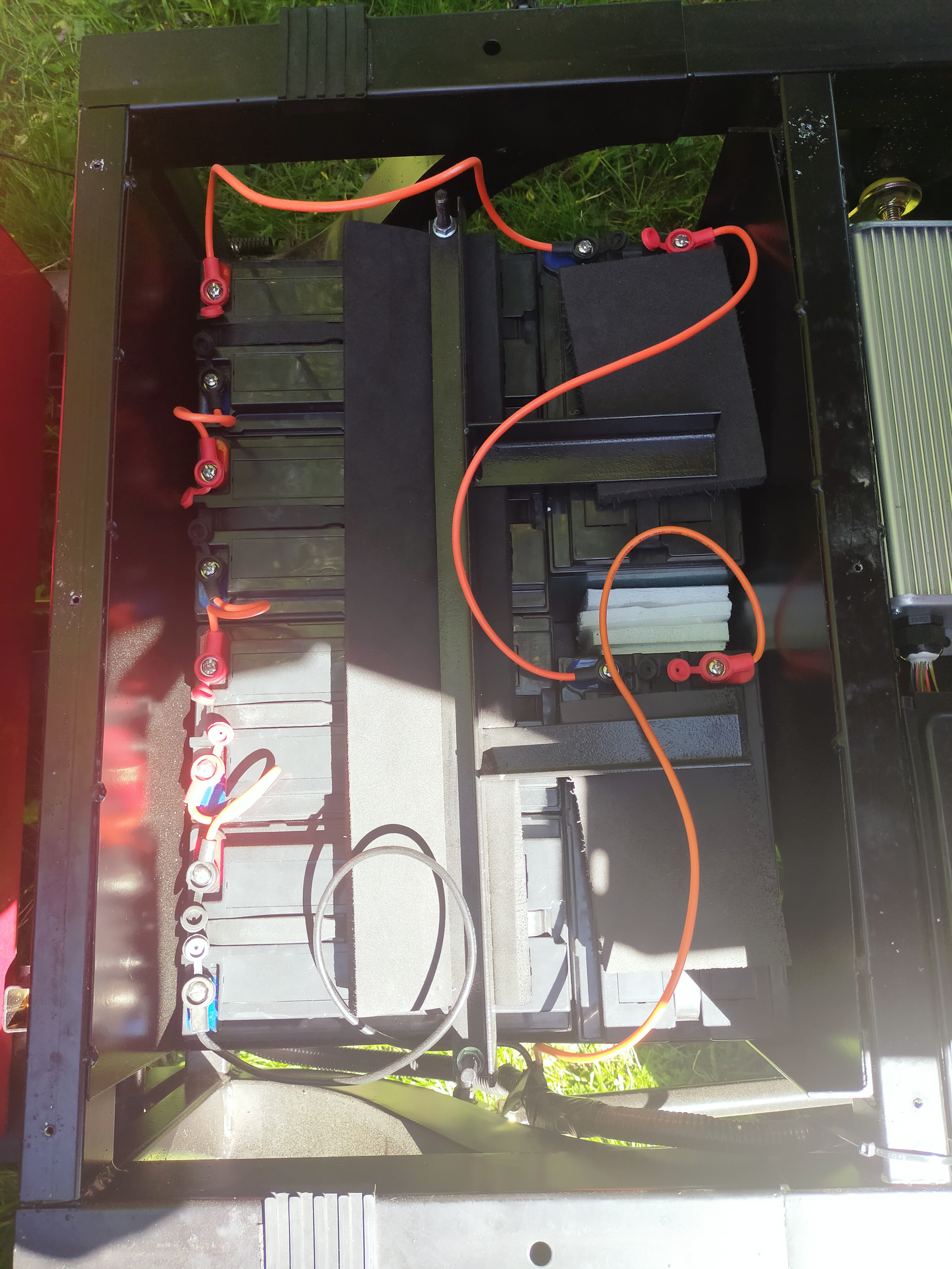 Am Anlieferungstag desVT5 habe ich die 72 V Bleigel Akkubank mittels des mitgelieferten 72 V 7 A Ladegerätes nachgeladen. Heute alle 12 V Akku mit einem 12 V Ladegerät dreimal desulfatiert und voll aufgeladen. Zwei lange orangefarbene Batterieverbindungskabel tauschte ich gegen zwei dickere gleichlange Batterieverbindungskabel aus. Angeliefert wurde der VT5 mit freiliegenden blanken Batterieanschlüssen, bei denen nicht die Abdeckdeckel aufgedrückt waren - Kurzschlußgefahr. Jetzt habe ich nach Beendigung des Aufladens der einzelnen Batterien die Deckel ordnungsgemäß aufgedrückt. Foto zeigen Auslieferungszustand und jetzigen Zustand. Den Die Batterieniederhaltungsschiene habe ich ausgebaut, um auf die originalen Akku 6 Bleigelakku mit jeweils 20 Ah daraufzulegen. Zweiter 72 V 20 Ah Strang wird parallel zum Originalstrang geschaltet. Irgendwann werden weitere Akku eingebaut und Stränge dann parallel geschaltet werden. Später sage ich mehr dazu.