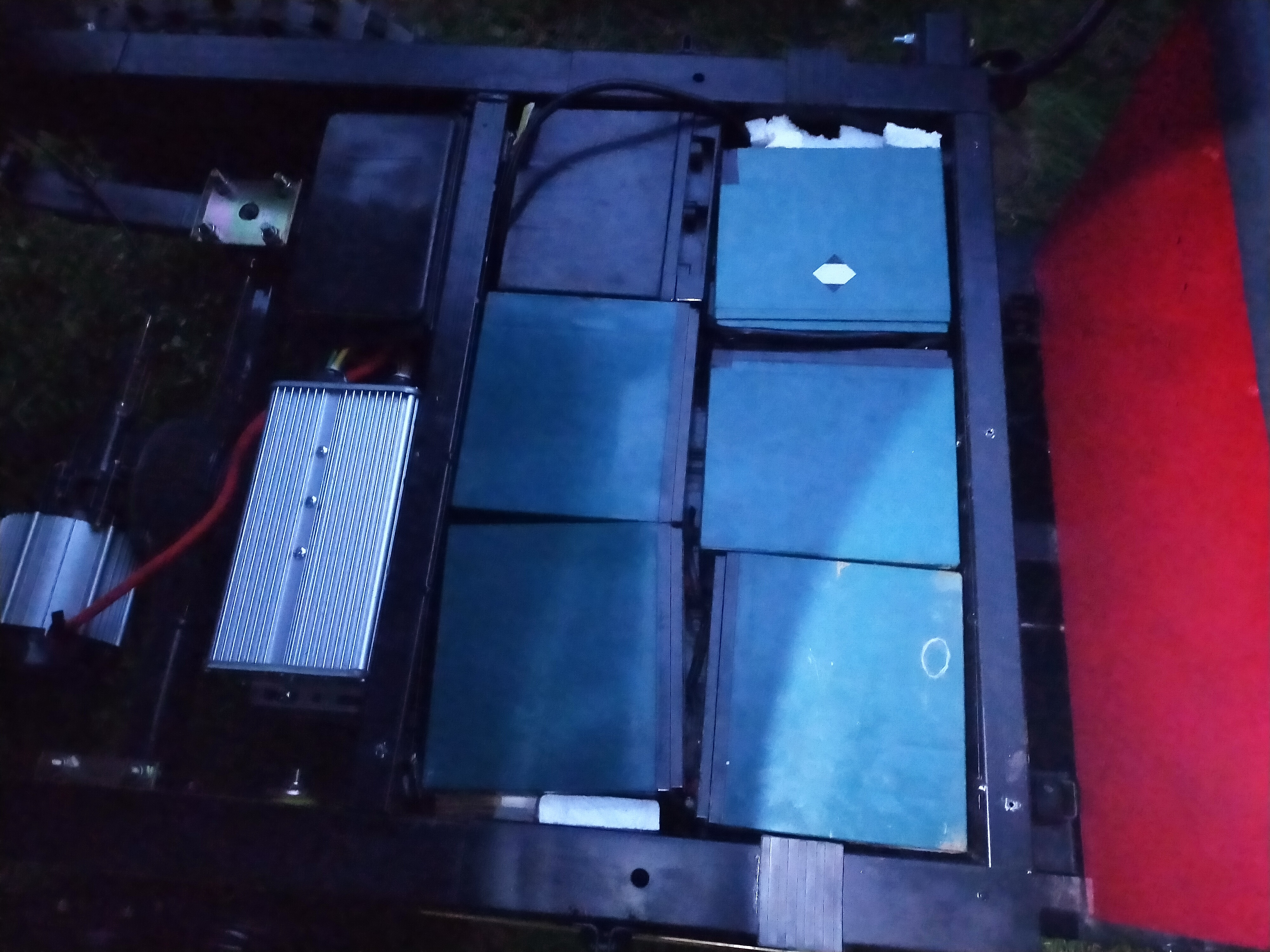Jetzt ist es dunkel geworden, ich habe es zeitlich bis jetzt gerade geschafft, die zusätzlichen 6 Stück 12 V 20 Ah Bleigelbatterien einzubauen. Ich verkabelte sie zu einem String mit 72 V 20 Ah und klemmte den String parallel zu den original im VT5 befindlichen 6 Stück 12 V 60 Ah K20 Bleigelbatterien. ( 72 V 60 Ah - vermutlich nur echte 40 Ah ). Das Batteriefach ist jetzt total plan ausgefüllt - siehe Foto. Das zweite Foto zeigt die von mir wieder aufgeschraubte Batterieabdeckplatte. Zuvor mußte ich zwei sich im Batteriekasten befindlichen Streben einkürzen mittels Eisensäge, Hammer und sehr großen Rohrzange. Die Streben sind nur aus Schmiedeeisen, es ist kein Stahl und läßt sich somit relativ leicht bearbeiten. Somit ist jetzt der VT5 mit einer angeblichen Nennkapazität von 80 Ah (vermutlich nur 60 reale Ah) Bleigel Akkubank mit 72 V ausgestattet. Ich warte schon ungeduldig auf den 1. Juni - Versicherungsbeginn, um eine Probefahrt machen zu dürfen.