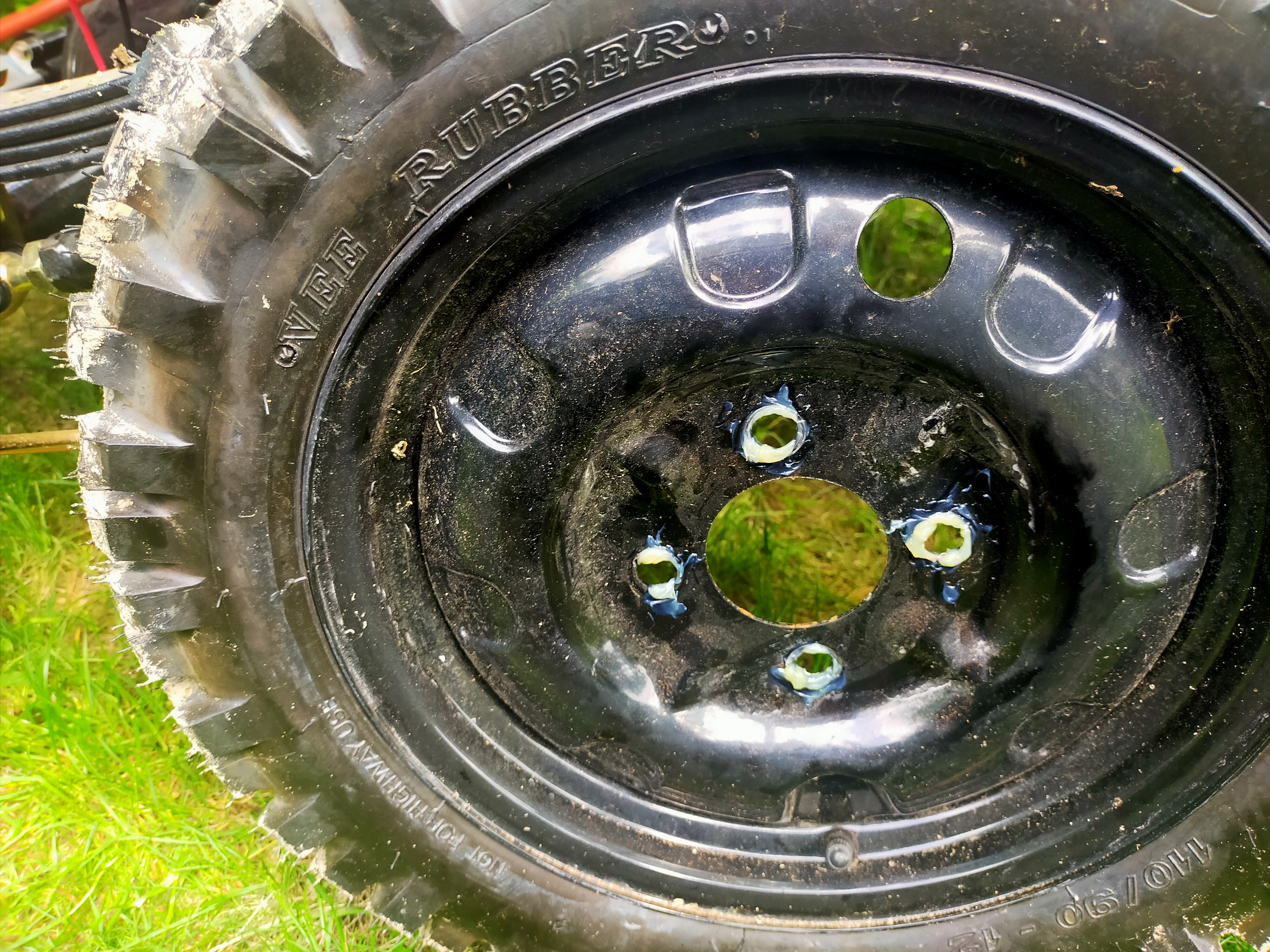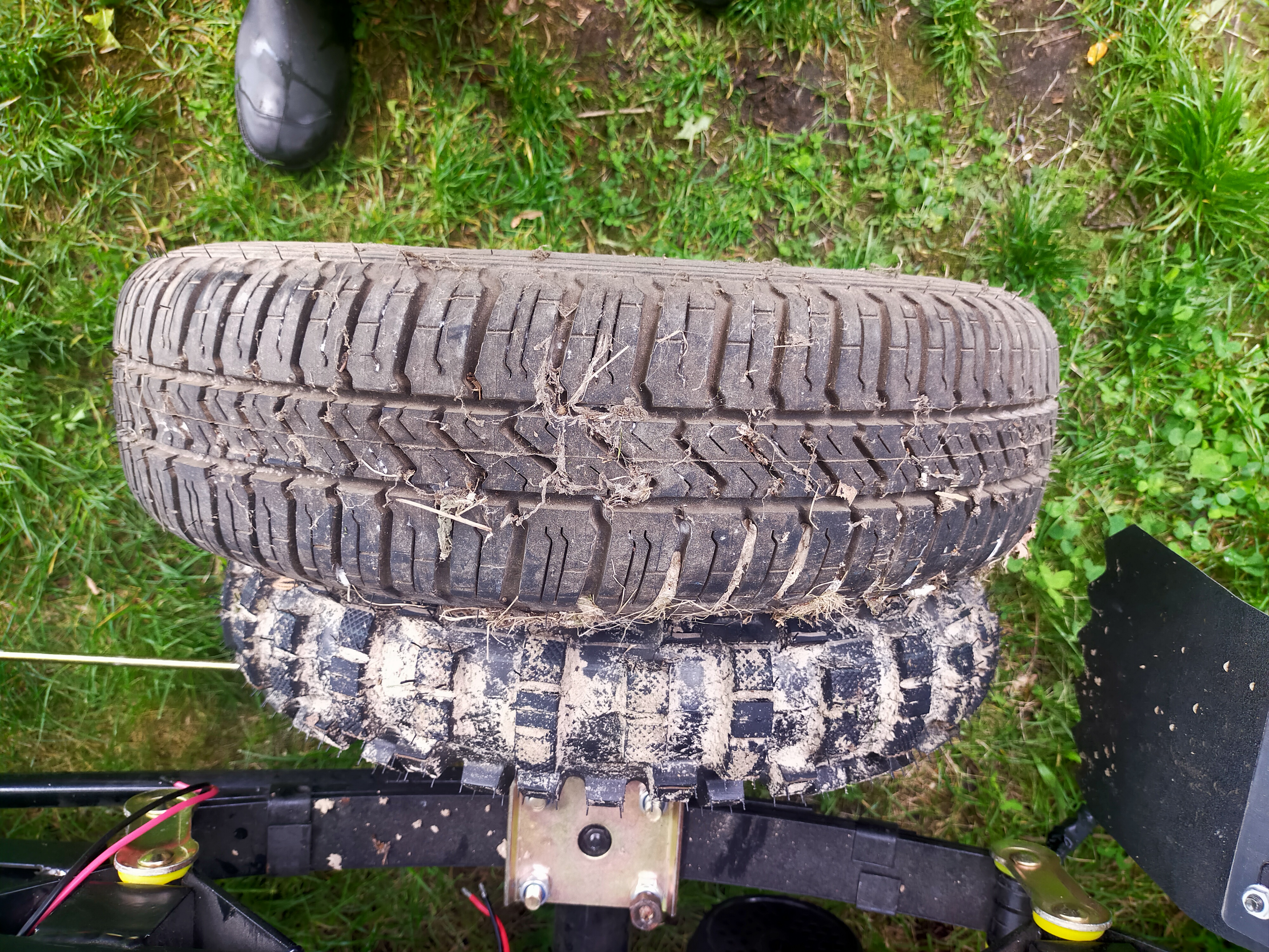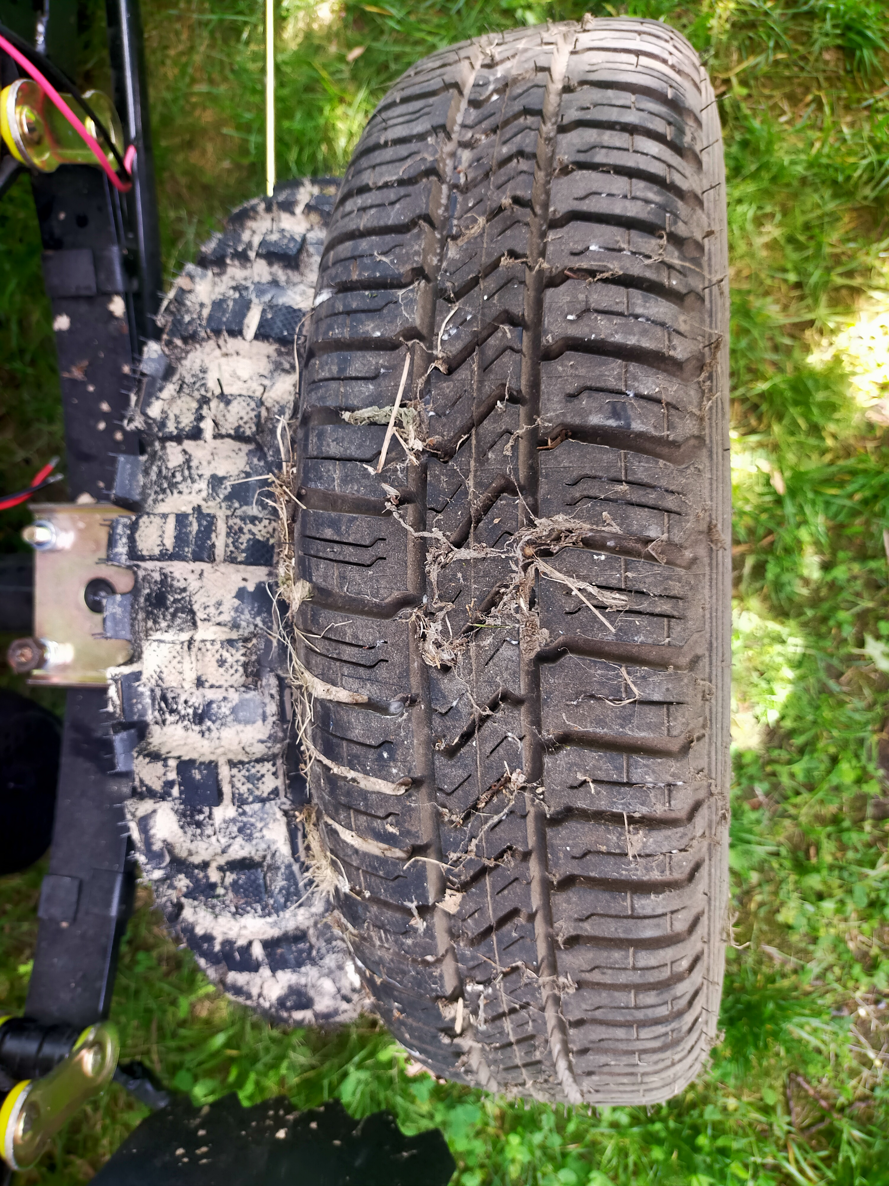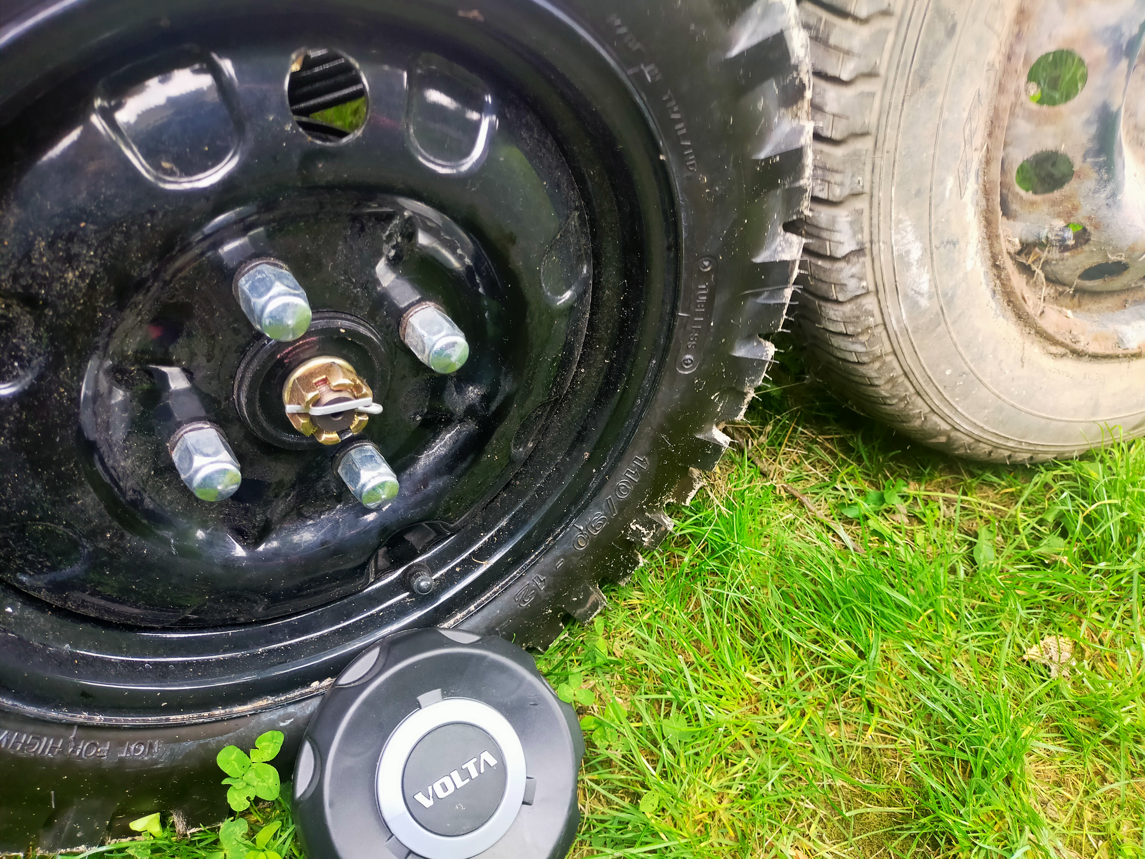 Größenvergleich der 110/90 R 12 zu 155/70 R 13 ist auf den Fotos zu betrachten. Der Schärenwagenheber muß vorn unter dem Rahmen gestellt werden, um genügend Kurbelfreiheit zu haben. Unter der Achse ist hinten nicht genug Bodenfreiheit zum Kurbeln des aus einem Renault Clio Baujahr 1997 entnommenen Schärenwagenhebers. Ich habe das Rad ausgebaut alle Radolzen und auch Mittelbefestigung eingefettet. Kreuzweise Radmuttern lösen und beim Zusammenbau auch kreuzweise anziehen. Volta Radkappe ist nur auf die Muttern gesteckt, ist nicht geschraubt.