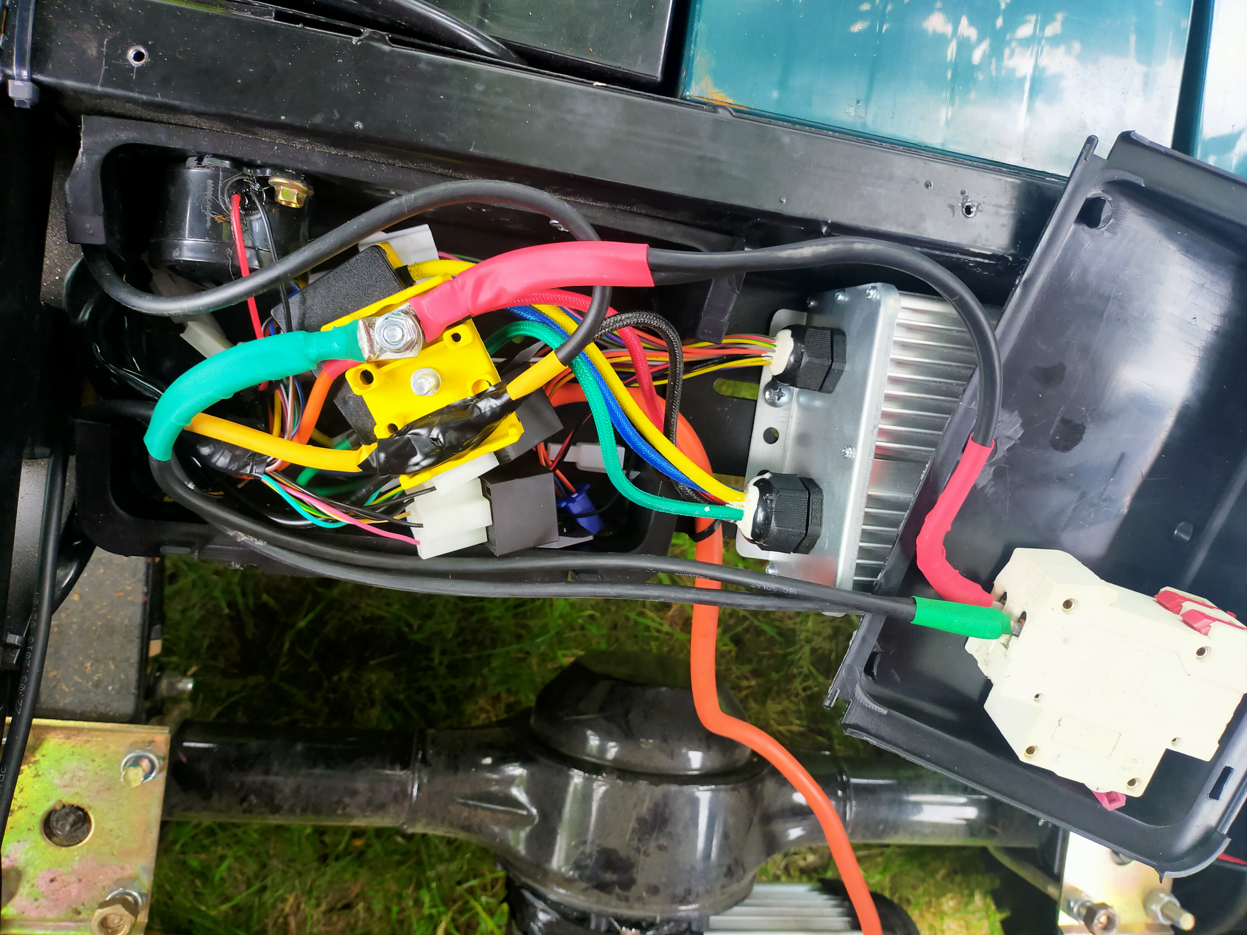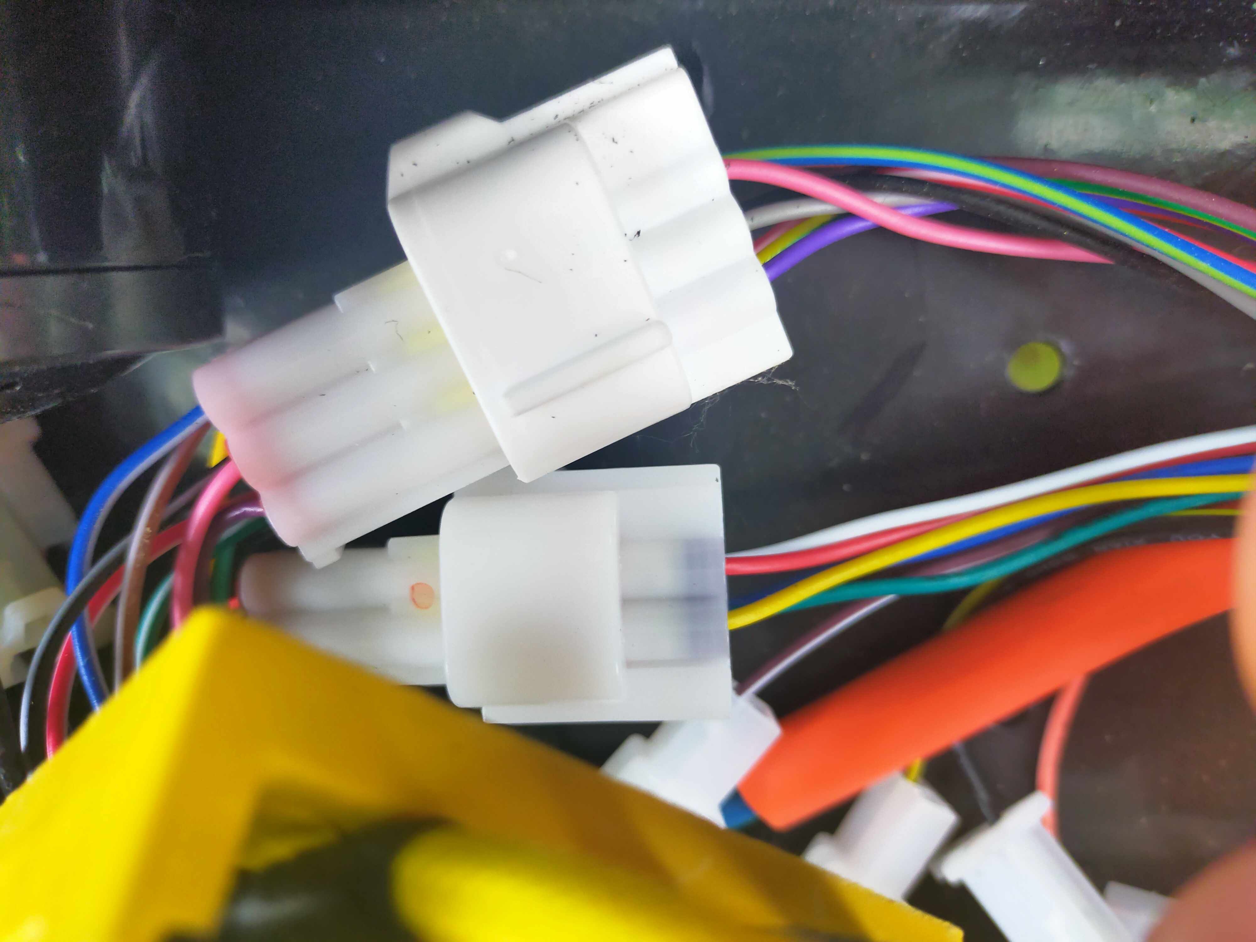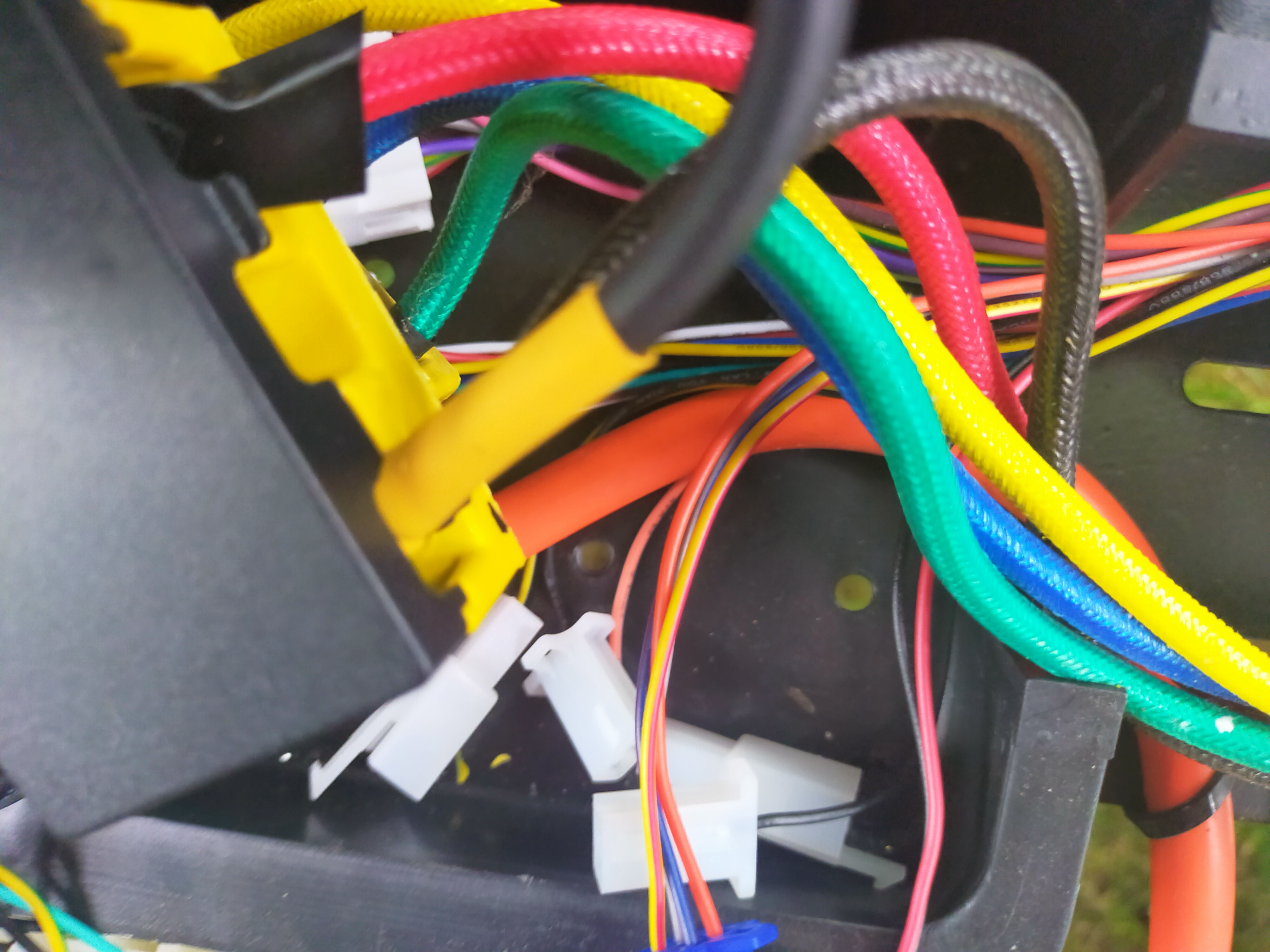 Ich habe photographiert, um anhand der Aufnahmen herauszufinden, ob high Break ( Recuperation ) oder Low Brake ( einfach nur die Stromunterbrechung mittels einer der Schalter am Bremshebel; hat die Fußbremse überhaupt einen Kontaktschalter ? ) an den Controller angeschlossen ist. Keine Kabelbeschriftung. Ich weiß es letztendlich nicht. Kann das jemand anhand der Fotos erkennen?
