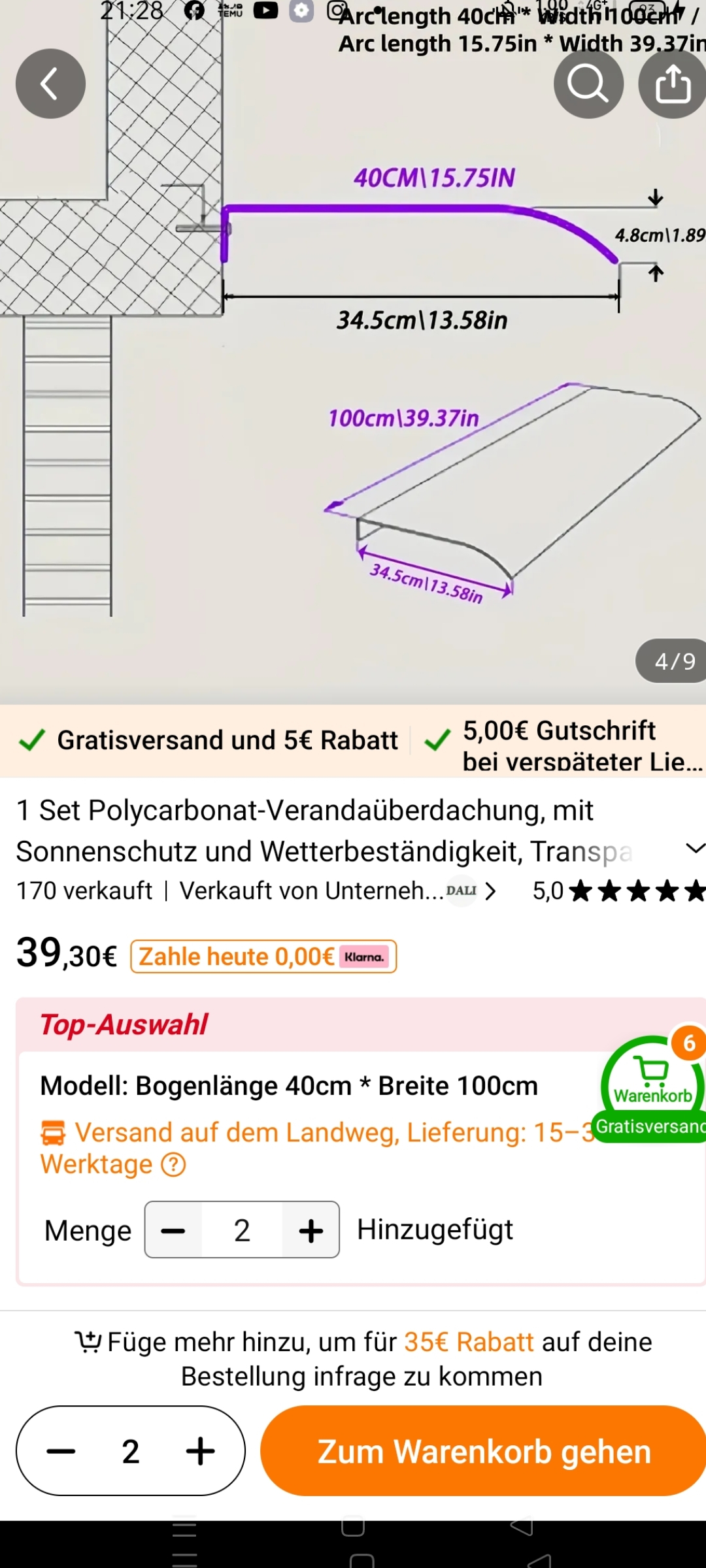 Ich kaufte zwei mal (zwei Stück bestellet zu jeweils 39,30 € )Polycarbonatüberdachungen. Anbringen möchte ich diese glasklaren, durchsichtigen, bruchsicheren an beiden Seiten des VT5. Insgesamt zwei Platten für insgesamt 98,60 €. Geliefert werden diese aus China auf dem Landweg oder Seeweg mit einer Transportzeit von einem Monat. Ich werde geduldig warten und bei Eintreffen weiter berichten. Gekauft bei Temu online Versandhandel. P.S. Verkaufsvideo zeigt einen Mann der auf den Platten herumsprang, Wölbung nach unten, ohne das die Platten zerbrachen. Somit will ich sie nicht nur als Regenschutz, sondern auch als Aufprallschutz bei einem Unfall.