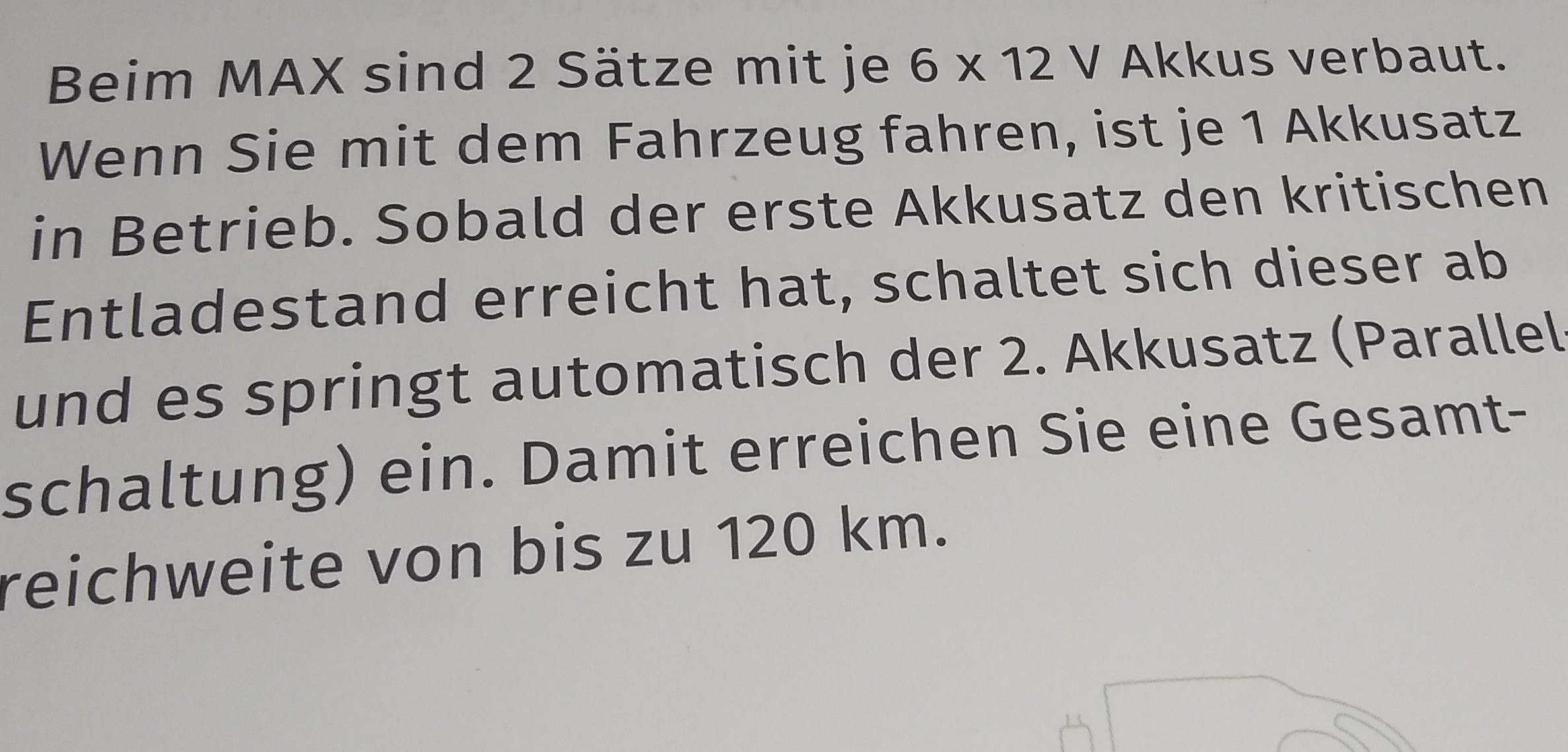dem ef Max anbietet, hat bei gleichen Motor (2,5 kW) und Batterie (12V58Ah Blei-säure Batterie) angaben nur eine Reichweite von 60 KM was stimmt den da?