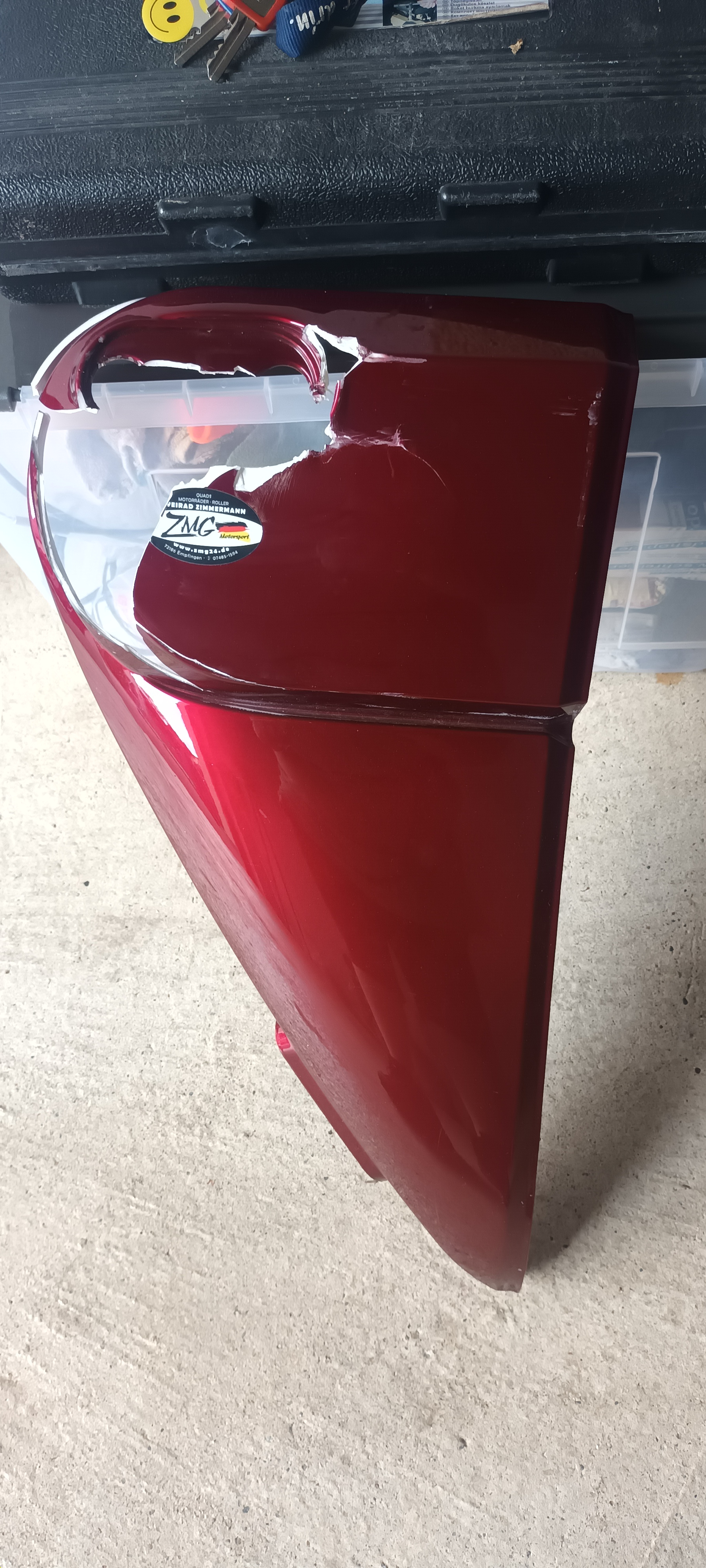 Das Teil ist ja nicht völlig zerstört, von daher, warum nicht mit Karton als Untergrund und dann mit Glasfasermatten und Glasfaserspachtel das Teil reparieren?