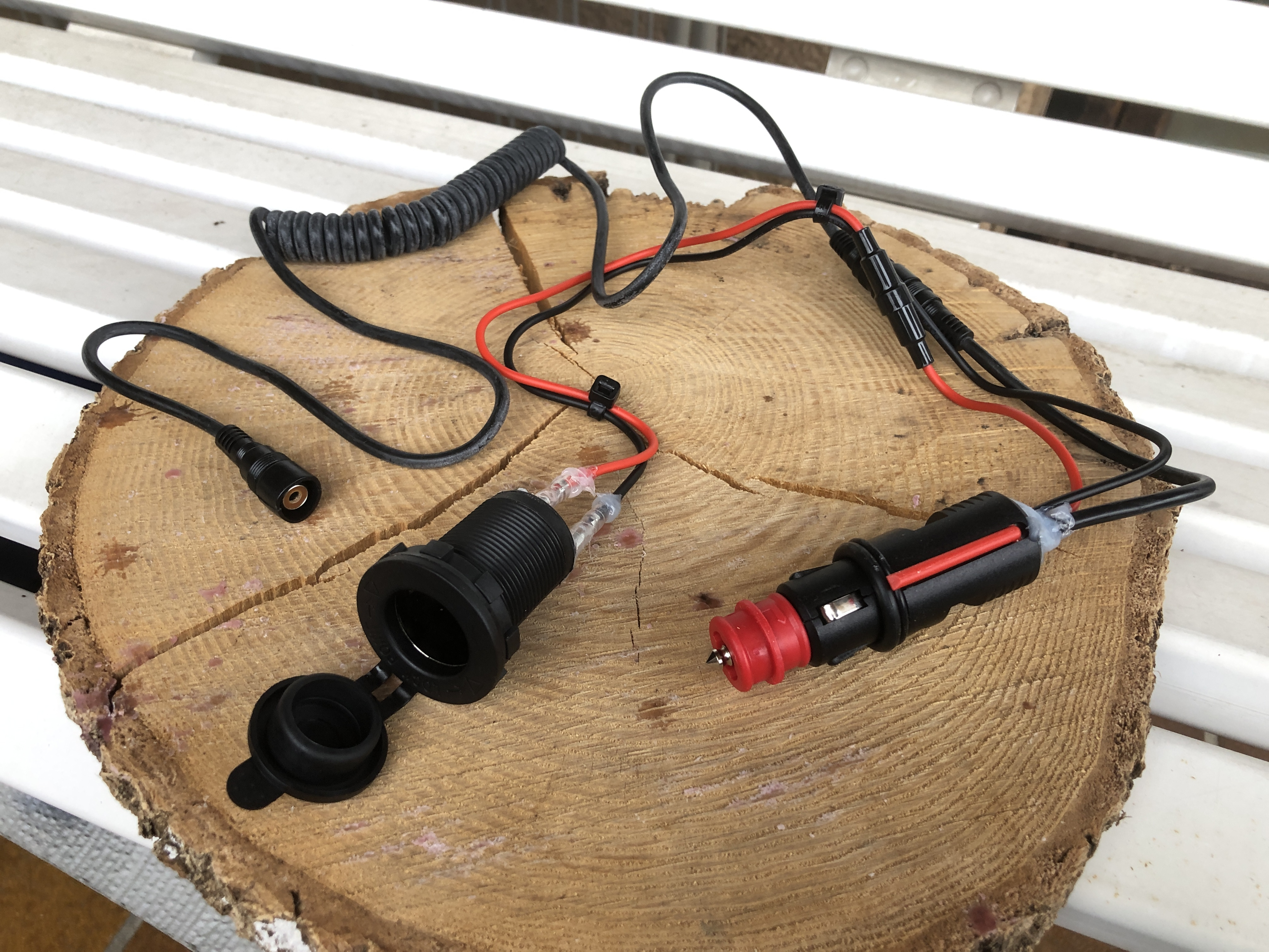 Ganz rechts das längere Spiral-Cinch-männlein-weiblein Kabel zur Verbindung von Helm und Stromversorgung, dann das motorradfeste Kabel mit Ringkabelschuhen, zum auf 12V Batteriepolen anschrauben, welche meine Zero ja nicht hat. Daher dann ein 12V Stecker, und ganz rechts eine 12V Einbaudose, die parallel an den 12V Stecker kommen soll, so dass ich trotzdem ggf. Handy oder Navi per USB Adapter versorgen kann.