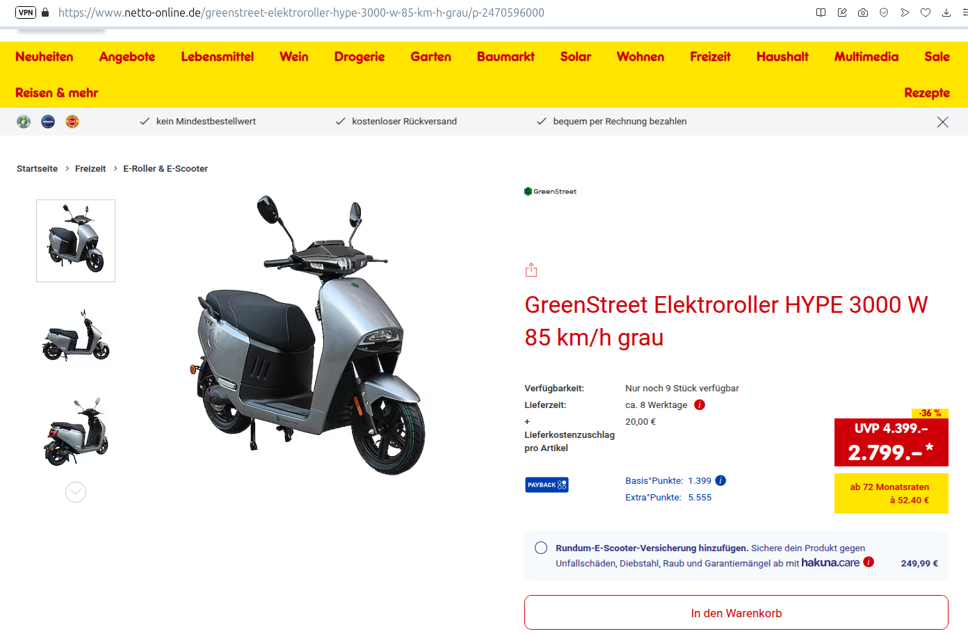 Netto-Online bietet derzeit den GreenStreet Hype mit 3,74 kWh-Akku, einem 3 kW-Radnabenmotor und 85 km/h schnell zum Sonderpreis von 2.800 € 2.825 € (incl. Fracht) an.