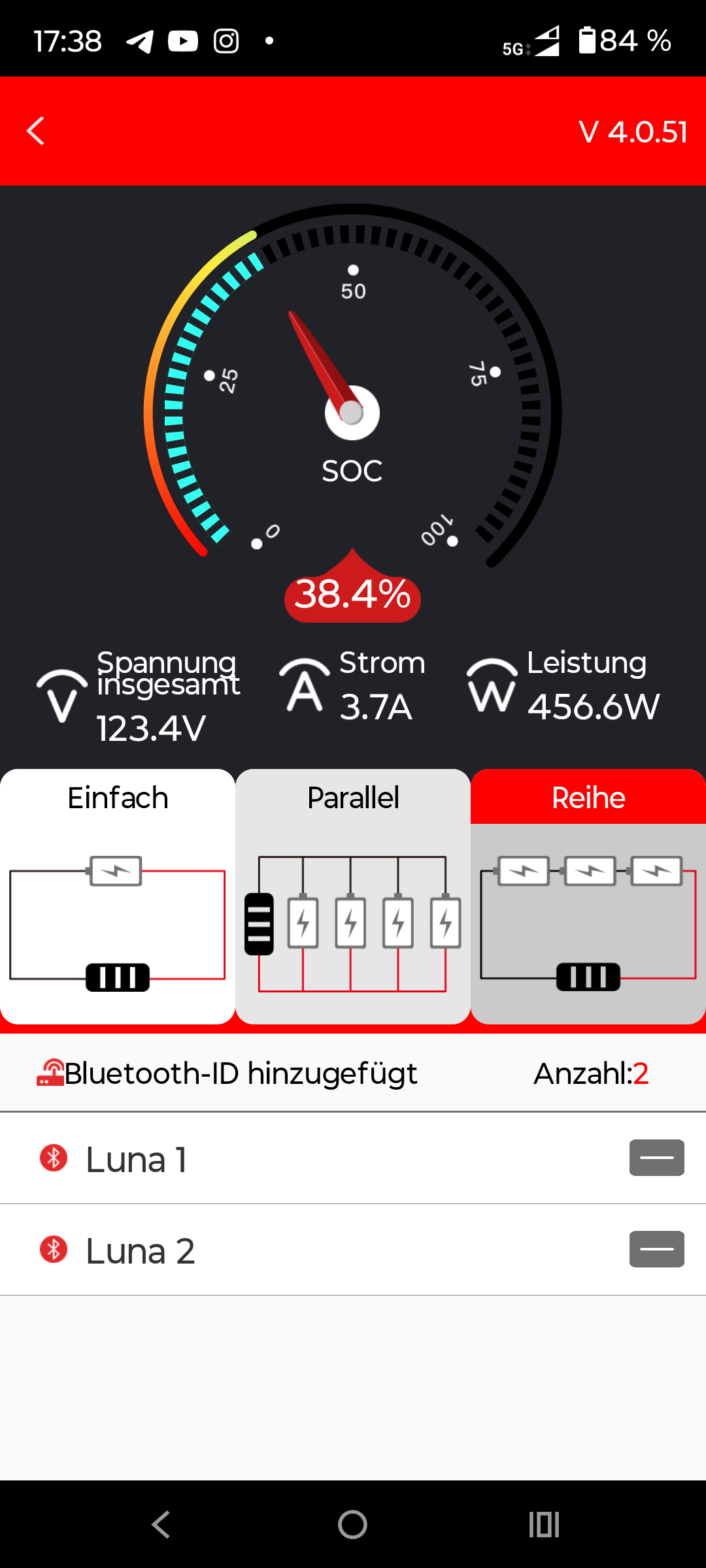 Wenn man die App " falsch" einstellt addiert er die Spannung von beiden Akkus, schön wäre geteilter Schirm und beide Akkus auf einem Telefon.