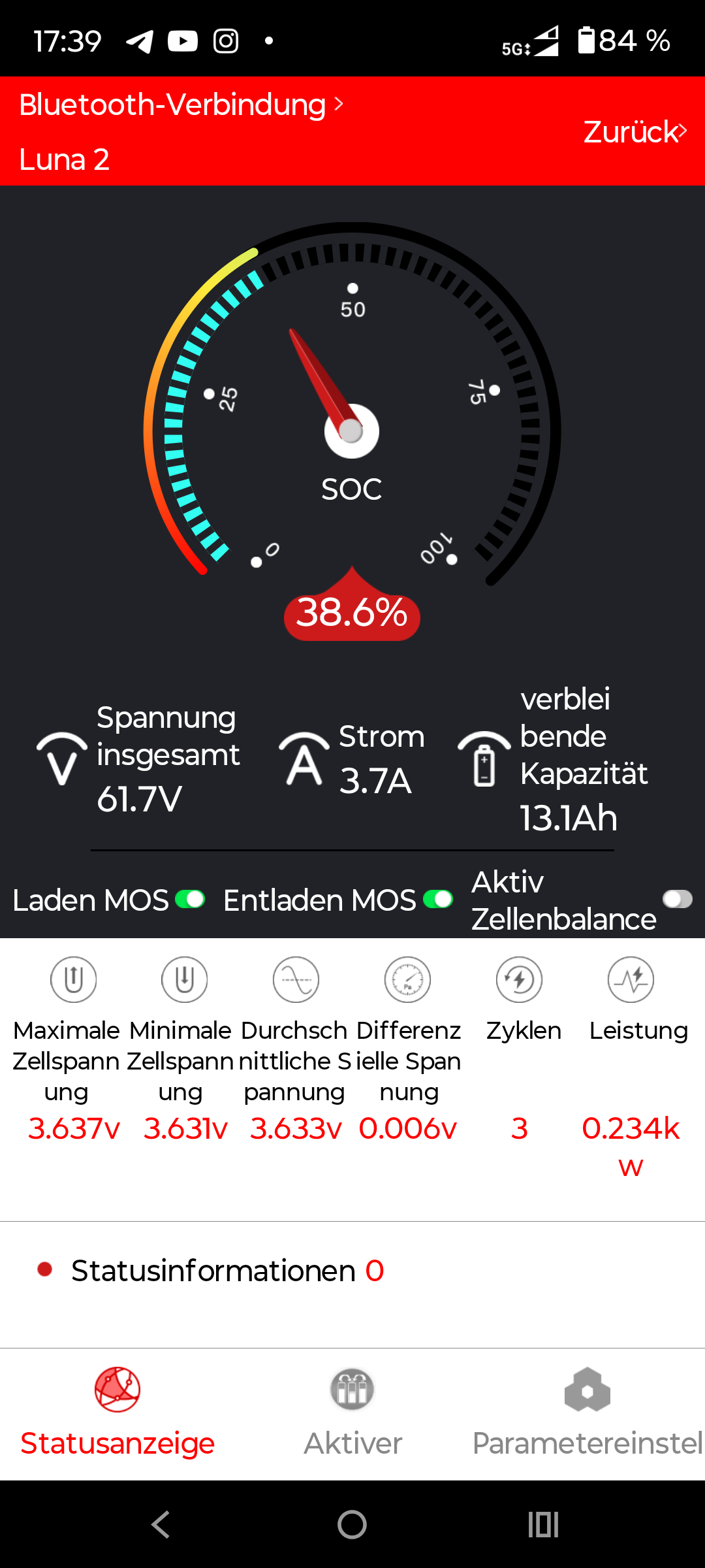 und ab geht die Post. Die Software vom besten Hersteller regelt viel zu zeitig die Leistung runter, die Akkus machen ihre Arbeit und können bestimmt etwas mehr Leistung erzeugen. Die Weiche im Roller scheint beide Akkus auf Spannung gleich zu halten und nimmt mal mehr oder weniger Ampere raus. Im Stand werden die 28 Watt für das System immer aus dem selben Akku genommen.