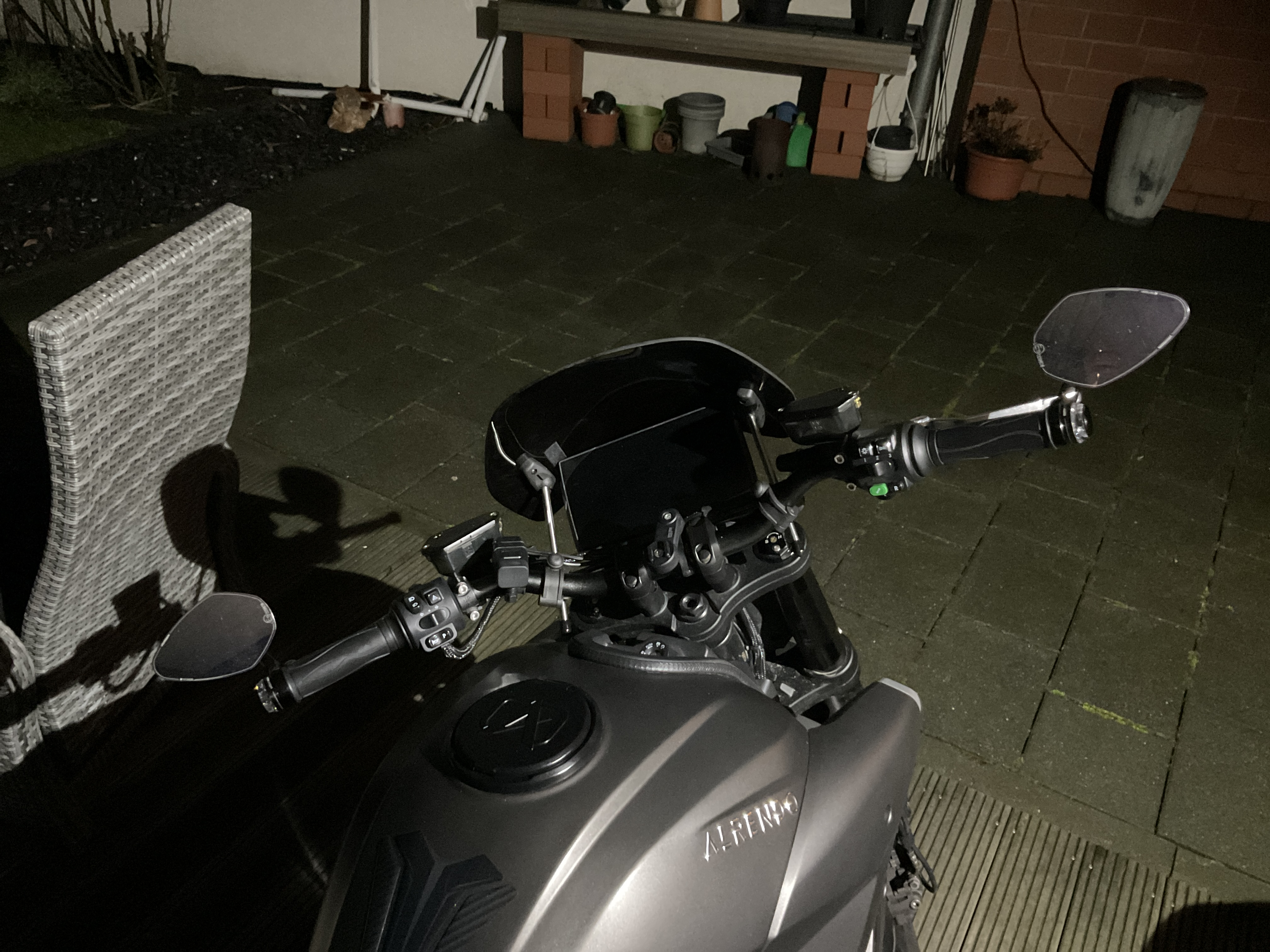 Montag oder Dienstag geht es zum TÜV, der Lenker und die Erhöhung haben zwar eine ABE, aber die ist fahrzeugspezifisch und die Alrendo ist natürlich nicht dabei. Daher müssen die Teile eingetragen werden. Spiegel und Blinker haben ein E-Zeichen und sind nach ECE zugelassen ohne Eintragung.