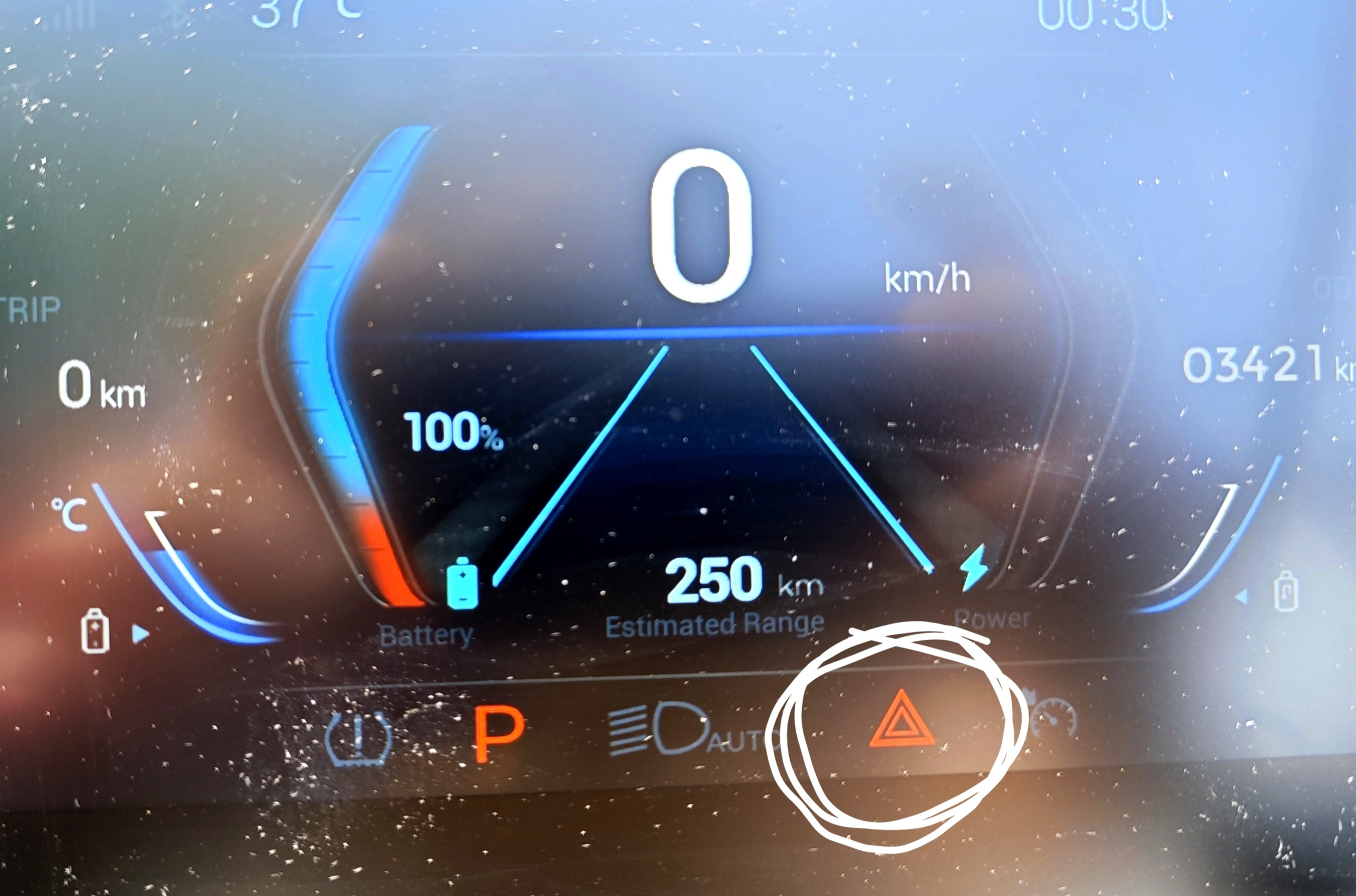 Als ich dann den Adapter an den ODB2-Stecker angesteckt habe und im ZCANPRO auf Start gedrückt habe, ging im Display der Alrendo ein rotes Dreieck an (siehe Photo), mehr ist nicht passiert.