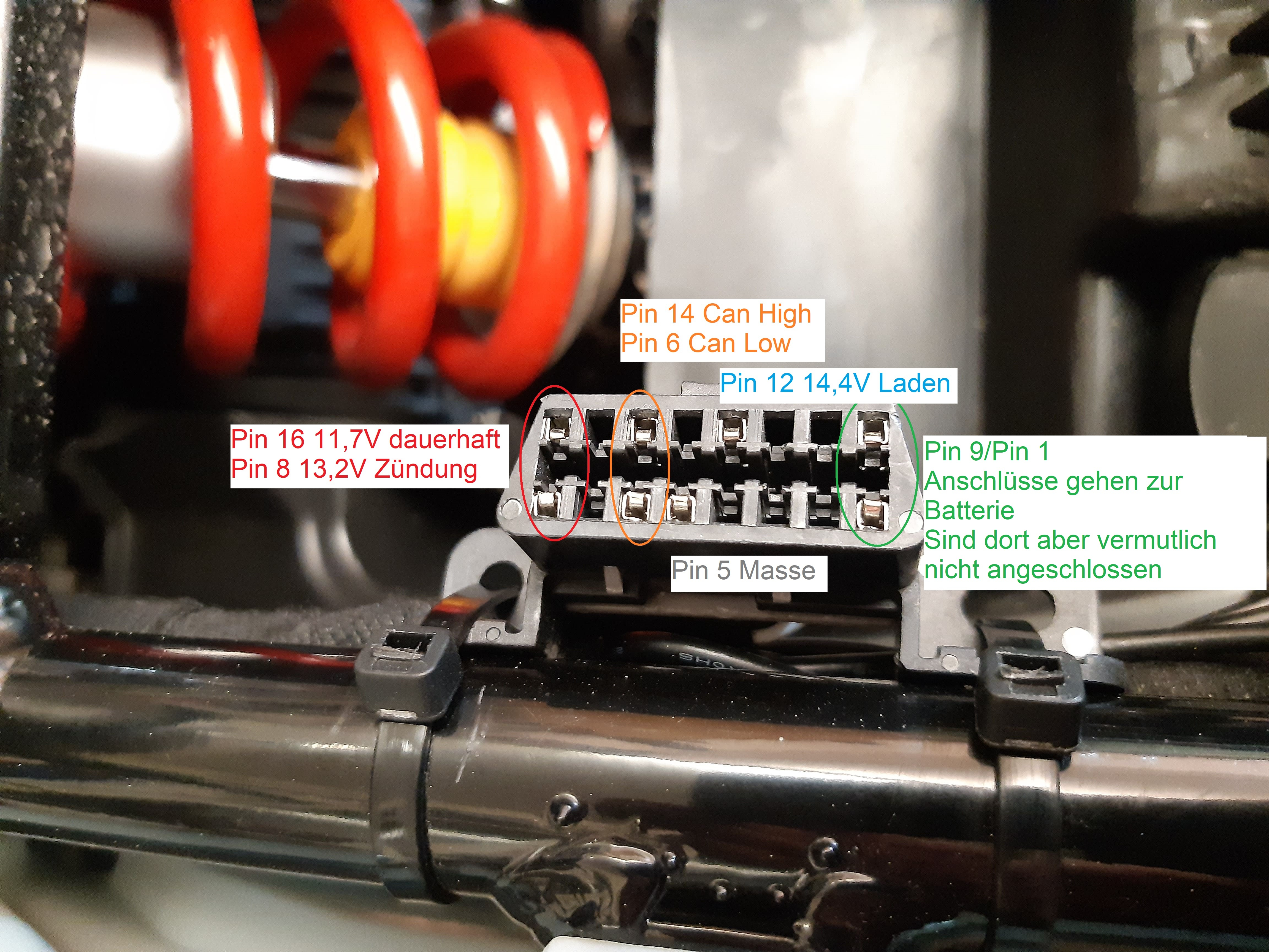 Pin 16 liefert 12V bei eingeschalteter Zündug, das reicht für meinen GPS-Tracker. .