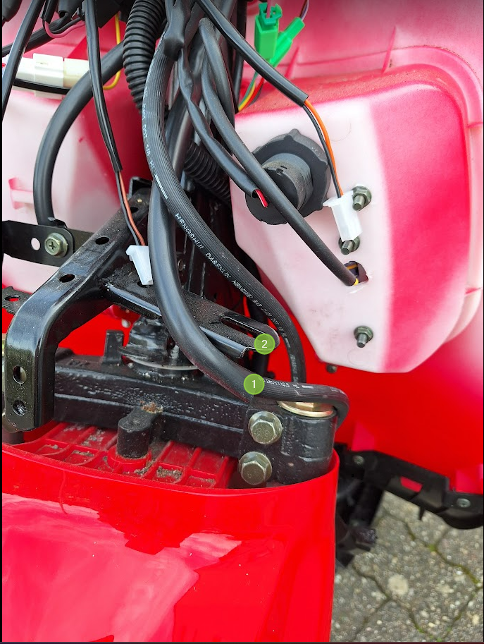 Nach öffnen der Verkleidung habe ich das vorgefunden. Die Leitung 1 bleibt beim schwenken der Lenkung an Teil 2 hängen. Grund: Der Bügel 3 ist zu schwach ausgelegt, dadurch ist die Leitung 1 aus dem Bügel 3 gewandert.