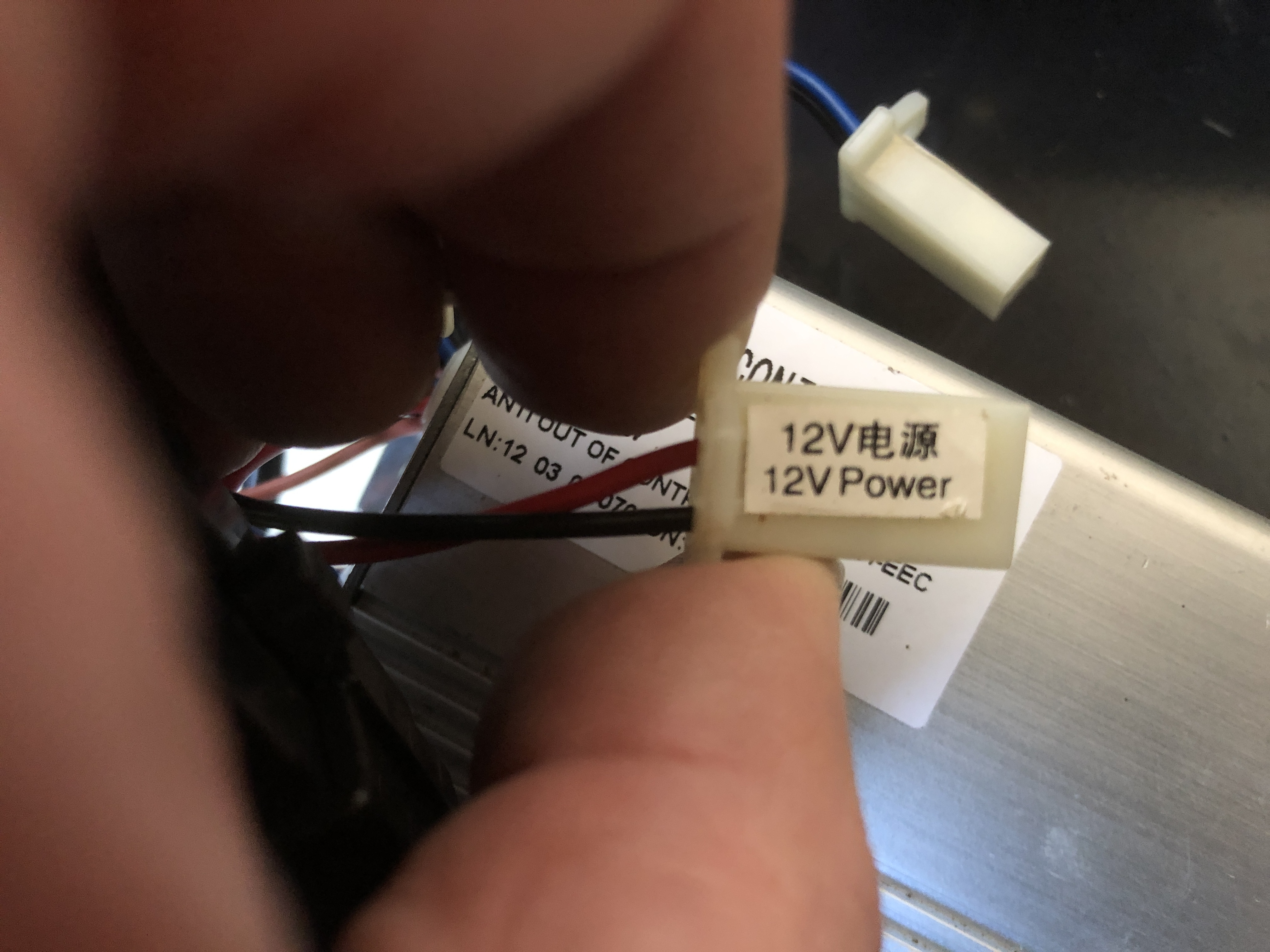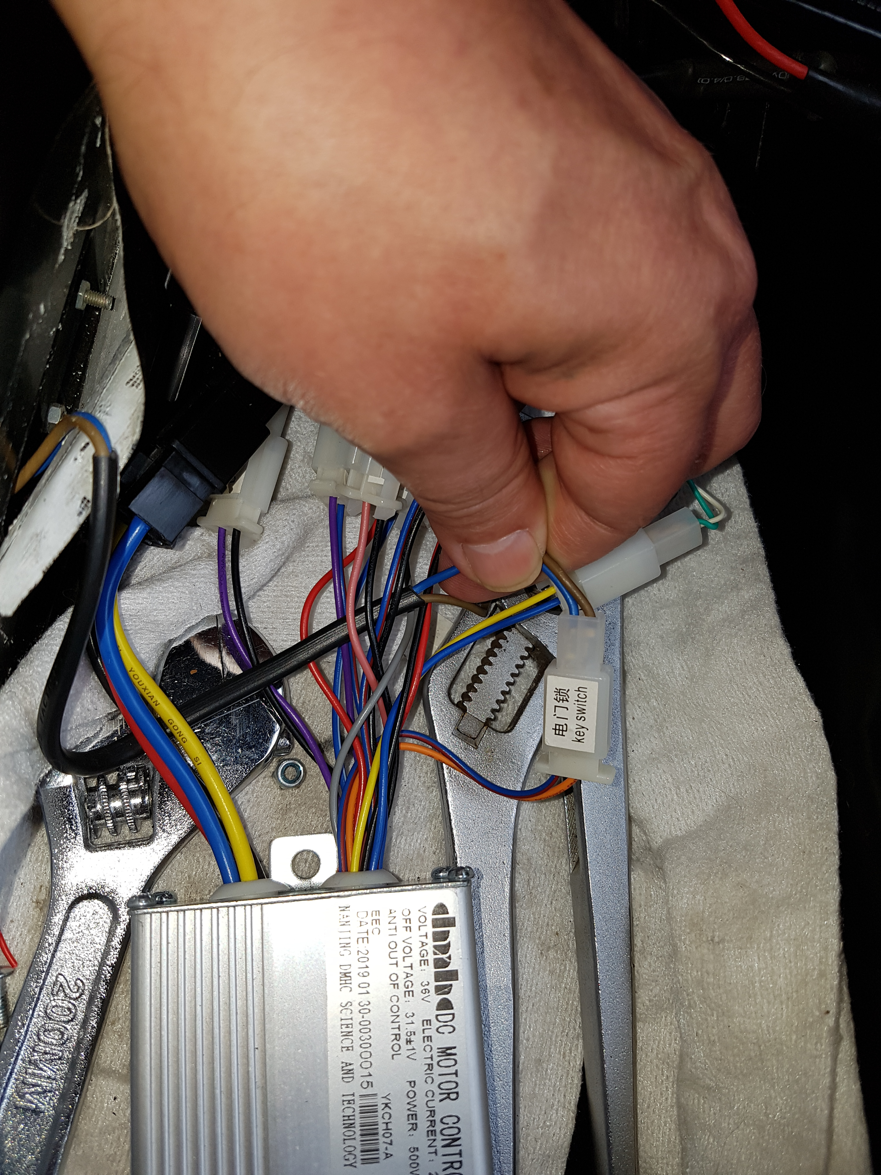 Da der meine keine Blinker hat, ist der Indicator-Stecker bei mir nicht belegt: Dann kommt der Bremshebelanschluss, zuerst gesteckt (dann hast Du alle Kabelfarben zum Zusammenführen), dann mit der controllerseitigen Beschriftung: Der 12V Ausgang: Ladeanschluss: Der kombinierte Motor (schwarz) und Anzeigenstecker (weiß): Der Anzeigenstecker: Der Fahrgriffstecker (3-adrig): Ein weiterer Doppelstecker, unbeschriftet einadrig und zweiadrig zum Bremslicht: Und noch der fette schwarze Batterieanschluss, der aus dem Controllerfach links unten rauslugt in den Batteriekasten: Und zum Schluss das alles wieder auf dem Regalbrett verstauen: