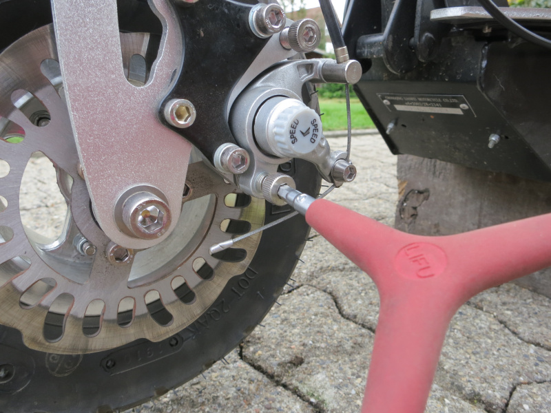Die Schutzkappe entfernen, die Kontermutter mit einem 10er Schlüssel lösen und mit einem 2,5mm Imbusschlüssel die Bremsklötze soweit öffnen, dass kein Schleifgeräusch mehr zu hören ist.