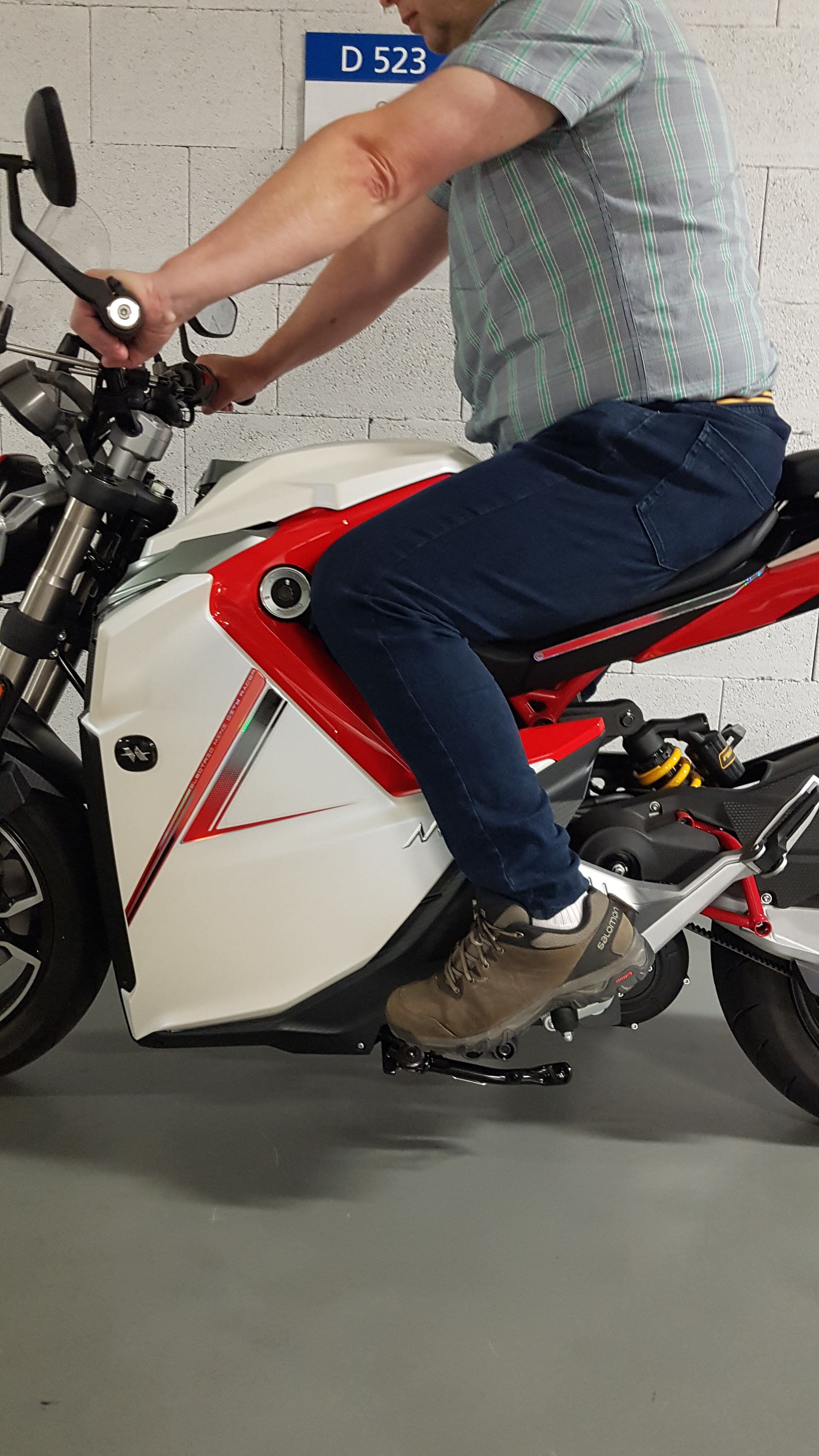 Bezüglich Geometrie und Sattelhöhe bin ich 174cm groß und habe eine Beinlänge von 75cm, Schuhgröße 43EU. Wenn ich meine Füße von den Trittbrettern absetze, kann ich mit beiden den Boden erreichen, unterhalb der Fersenmitte befinde ich mich 8 cm über dem Boden (für beide Füße gleich).